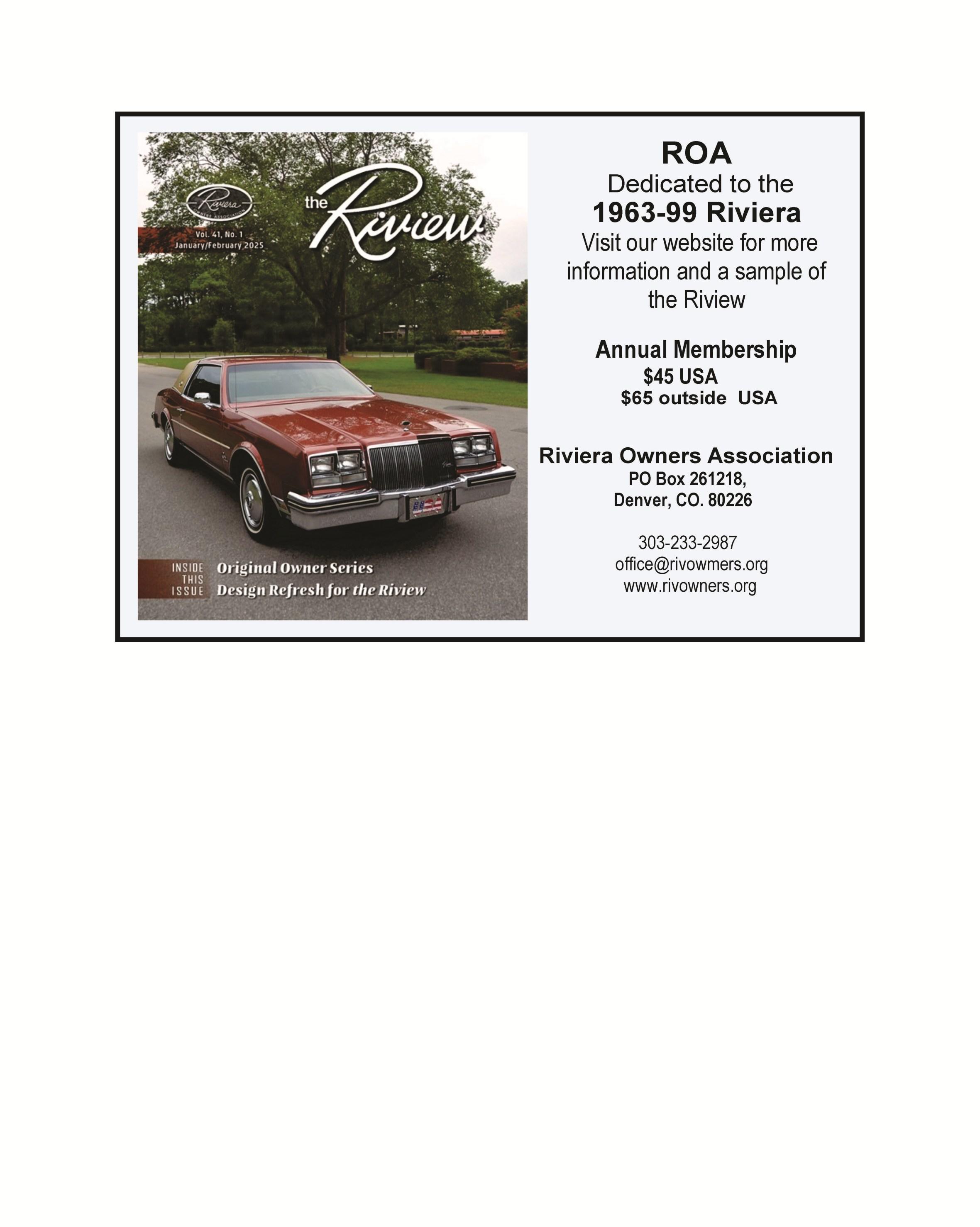 June 18-21, 2025 - Springfield, Illinois. The Riviera Owners Association will hold its annual meet at the Northfield Inn. Everyone is welcomed to view the car show and shop vendors on Saturday from 9AM to 2PM. Details posted on rivowners.org.