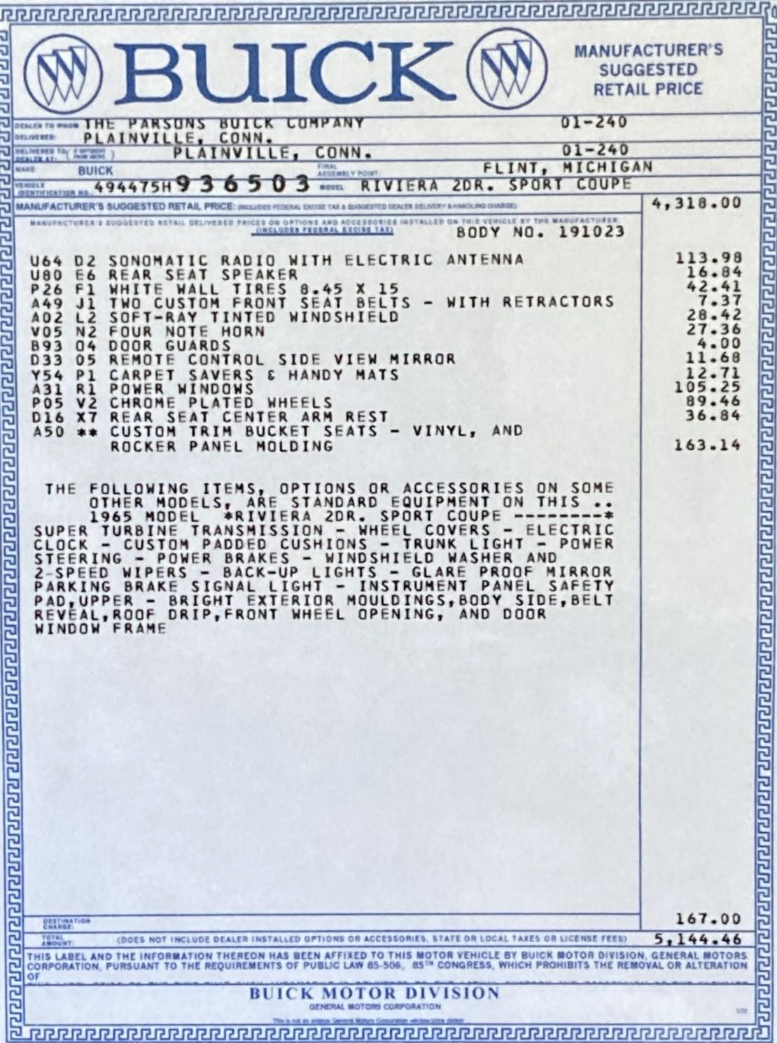 1965 Riviera NOS: wheel opening moldings, $800. Passenger door skin, $300. Used: black wood door panels, more. Four ads: Craigslist>LosAngeles>Auto Parts. Trent, BCA #19794, 310-378-6826, sportwagon@juno.com (7/25)