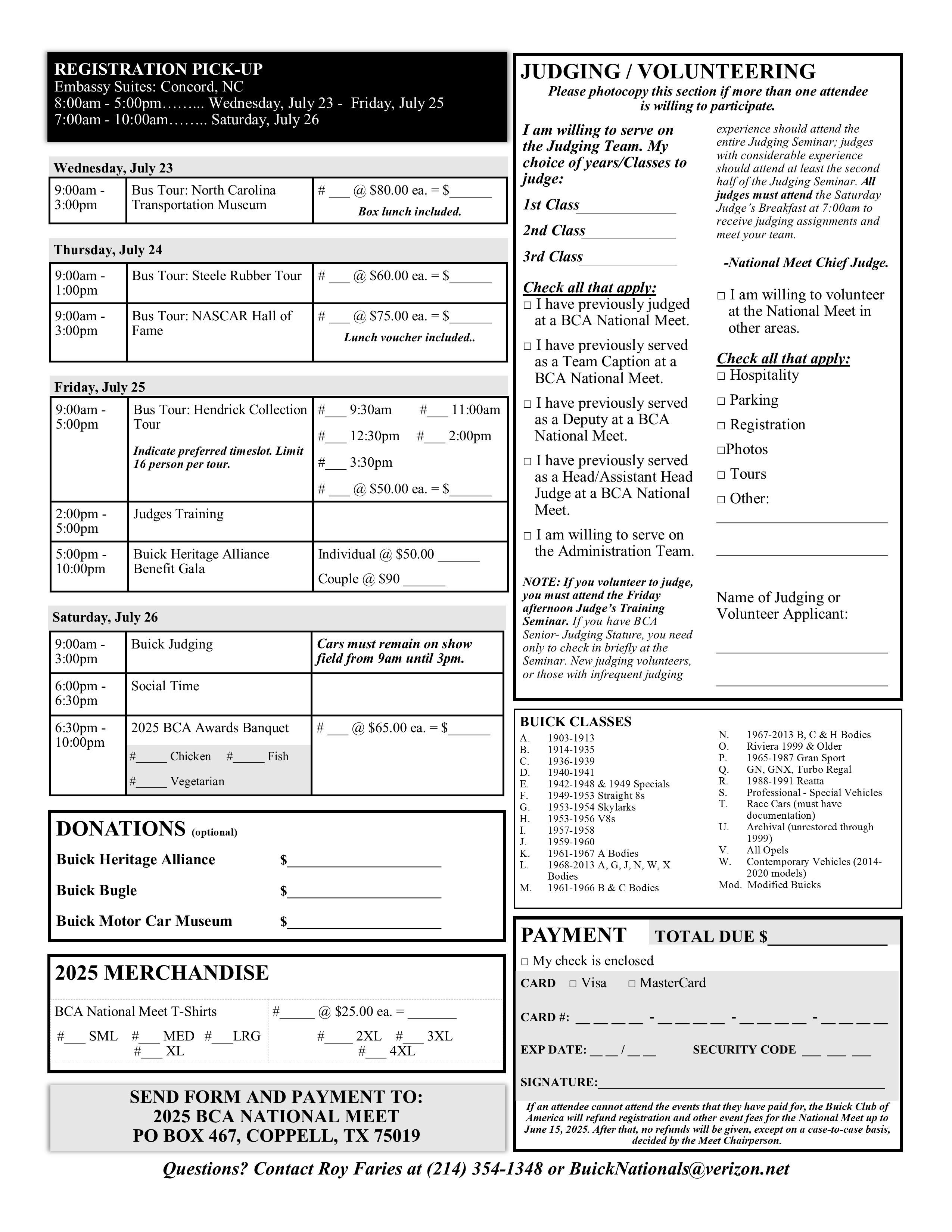 July 23-26, 2025 - Concord, North Carolina. Join us for the 2025 Buick National Meet in Concord, NC, July 23-26, 2025. Tours include Rick Hendrick's private collection, Steele Rubber, NASCAR Hall of Fame, and N.C. Transportation Museum. Bring your Opel or Buick, new and old, and enjoy an event to remember. Host hotel: Embassy Suites Concord (site of 2012 National Meet). 400-point judging,