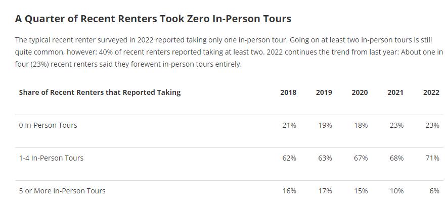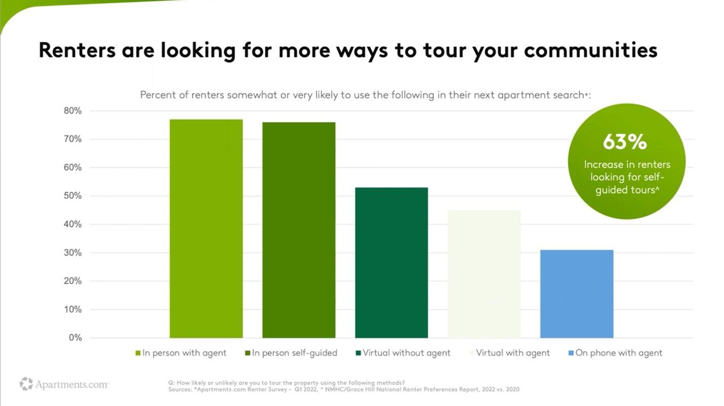 Tour24’s self-guided tour data shows that 64% of tours are same-day tours, and 24% happen within 15 minutes of scheduling time. 24% means the potential renter is right outside the community and wants to tour immediately.