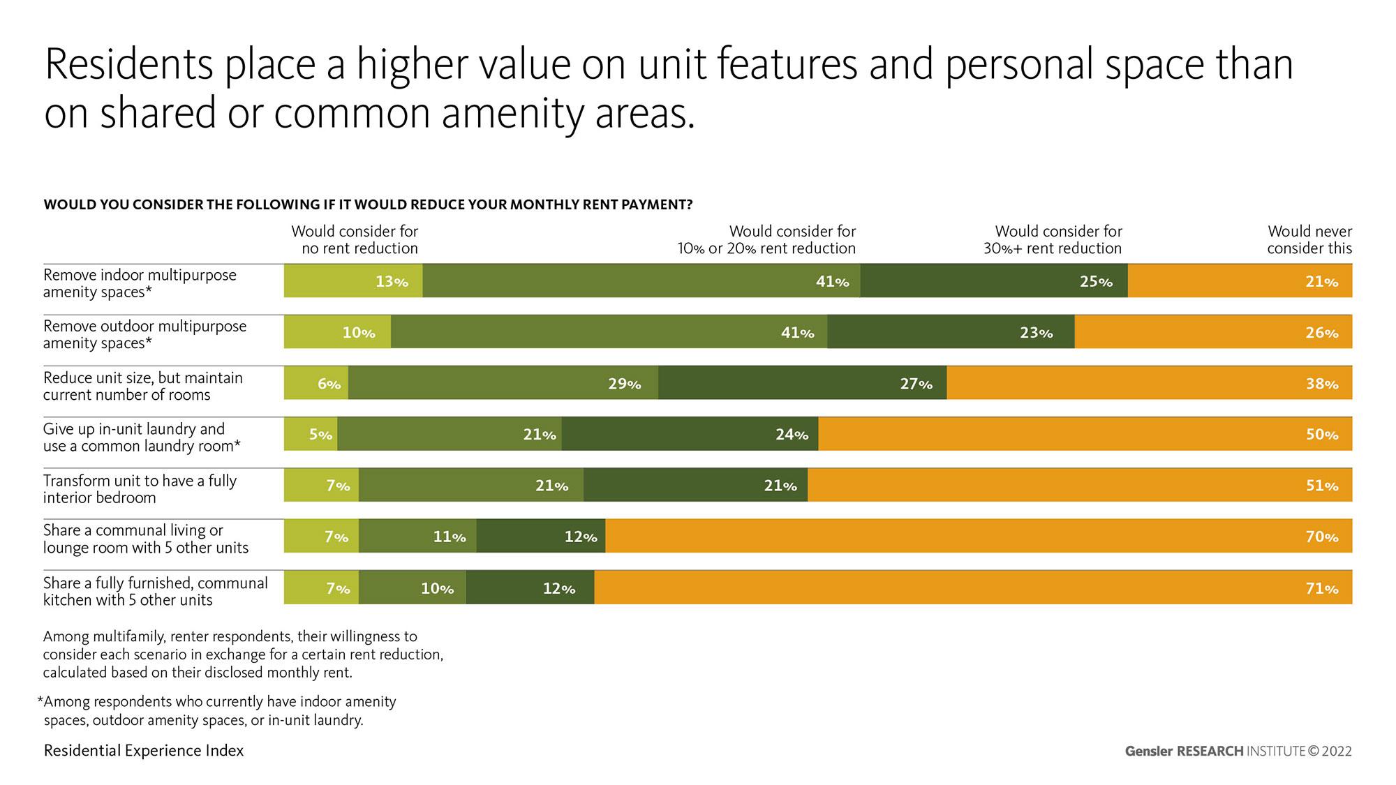 “We must find a better balance between investing in the unit and building amenity areas, which have long dominated development and design conversations. Our research reveals that focusing on design solutions for poor layouts, inadequate storage, and noise issues would build a solid foundation for improving the overall unit experience and better supporting the diverse activities that occur in today’s homes, from working and exercising to cooking and relaxing.” GENSLER 2022