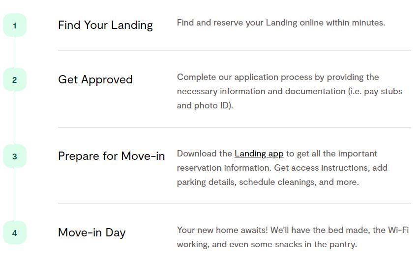 Landing uses data on pricing and demand around the country to zero in on multifamily buildings around the U.S. Through performance marketing and referrals, it then finds tenants for these apartments, itself signing one-year leases, then quickly moving in everything from furniture to utensils for the tenant. Landing has the furnishings made overseas and shipped to warehouses in Austin, Phoenix and Alabama, where it is based.