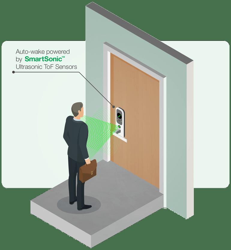 When a person walks up to a door, once the ultrasonic sensor determines that they are approaching the door it wakes up a processor that checks for image recognition. This is similar to the architecture found in smartphones that use facial recognition to unlock them; the camera isn’t always on, waiting for a face to appear, as that would waste power.