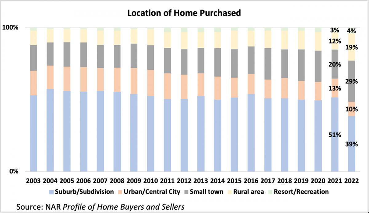 The shares of buyers who purchased homes in small towns (29%) and rural areas (19%) were the highest ever recorded, while the shares of homes purchased in suburban (39%), and urban (10%) locations declined from one year ago. NAR 2022 BUYER & SELLER REPORT