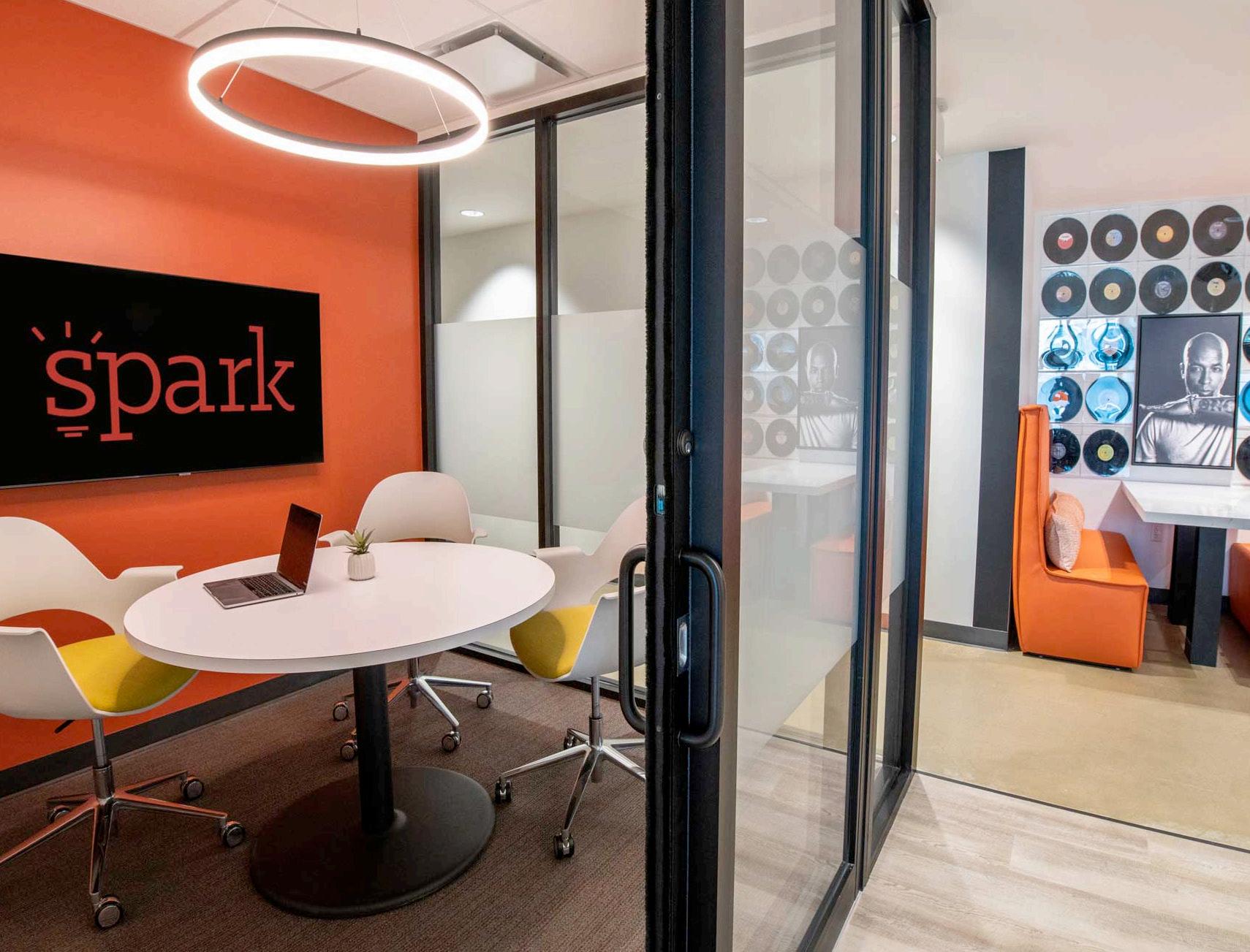 Downtown Kansas City’s Two Light luxury high-rise includes Spark Coworking on its first floor. The facility consists of 15,000 square feet of mixed-use workspace, including open tables, private desks, meeting rooms, and lounge areas. Two Light residents will be eligible for work/live leasing packages, but non-residents can also join Spark, creating a vibrant collaborative space.