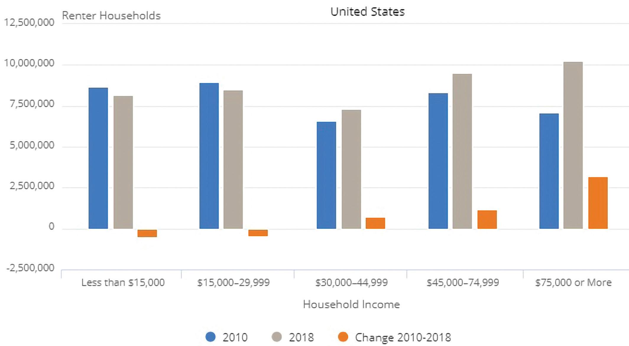 DEMOGRAPHIC: With nearly 67 million people aged 20–34 in the United States, the pool of prime renter age individuals is larger than ever. Additionally, roughly 4.3 million people will turn 18 each year from 2022 through 2030. And the rising senior market: households headed by people aged 65 and older are expected to grow from 34 million to 48 million in the next two decades.