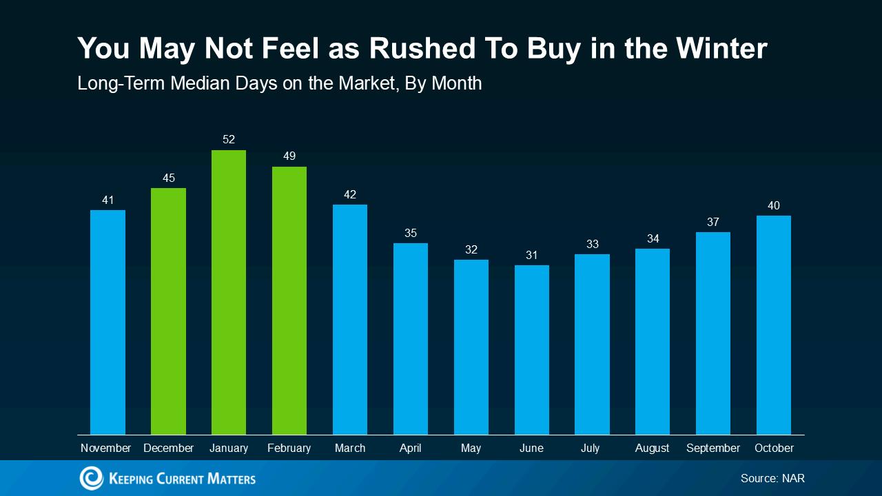 Thisispartlybecausefewerbuyersareactiveatthistimeofyear–and that decrease in buyer competition means the houses that are on the market aren’t going to be snatched up as quickly So, if you decide to buy a home in the next couple of months, you’ll likely have more time to consider your options and negotiate a deal without feeling as pressured
