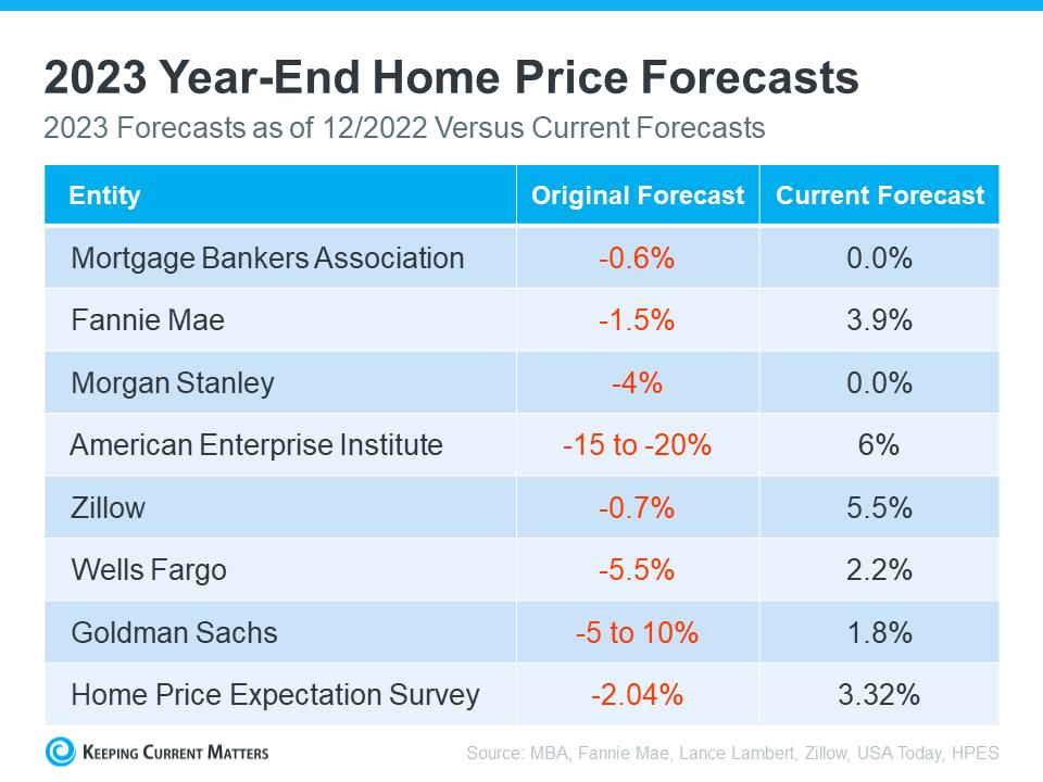 This visual shows the 2023 home price forecasts from seven organizations. It provides the original 2023 forecasts (released in late 2022) for what would happen to home prices by the end of this year and