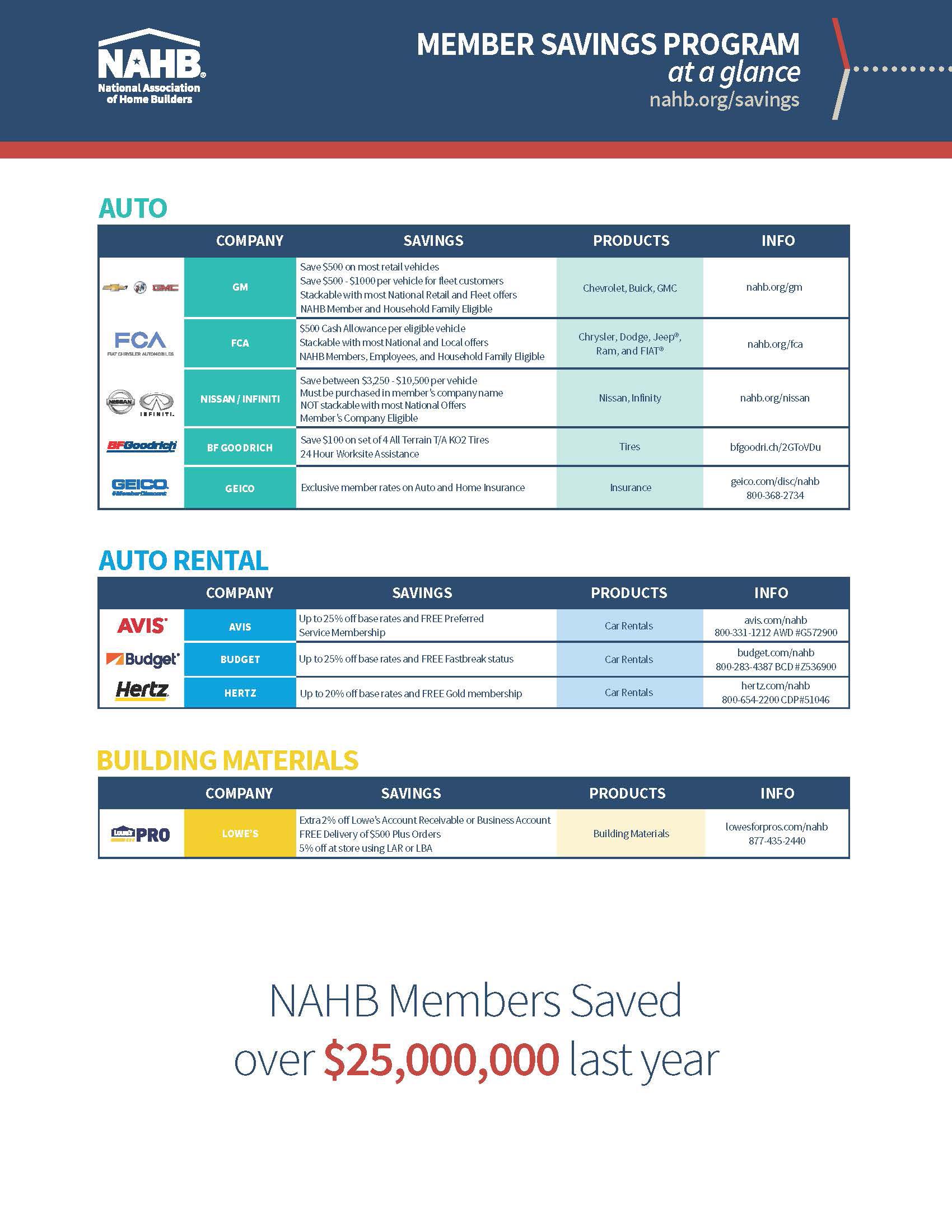 See the NAHB "Member Savings Program at a Glance" handout for a full list of available discounts!