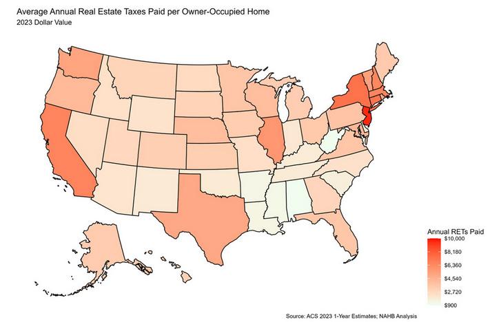 The average annual real estate taxes paid in 2023 across 86 million owner-occupied homes nationwide was $4,112, according to NAHB analysis of the 2023 American Community Survey. Compared to 2022, every state saw increases in the average amount of real estate taxes paid. two full bathrooms, 23.8% had three full bathrooms, 6.9% had four or more full bathrooms, and only 4.6% had one full bathroom or less.