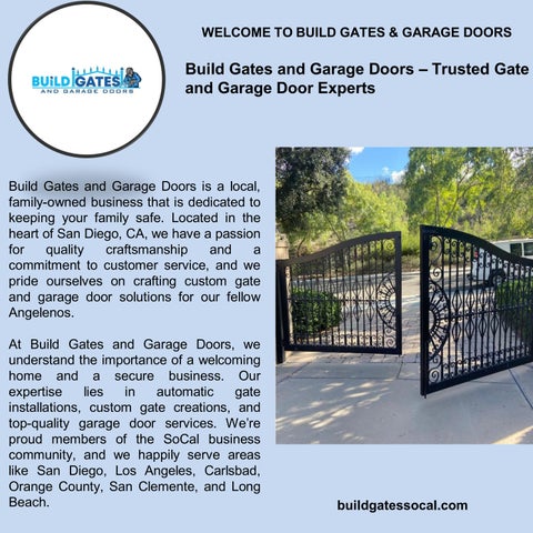 At Build Gates and Garage Doors, we understand the importance of a welcoming home and a secure business. Our expertise lies in automatic gate installations, custom gate creations, and top-quality garage door services. We’re proud members of the SoCal business community, and we happily serve areas like San Diego, Los Angeles, Carlsbad, Orange County, San Clemente, and Long Beach.