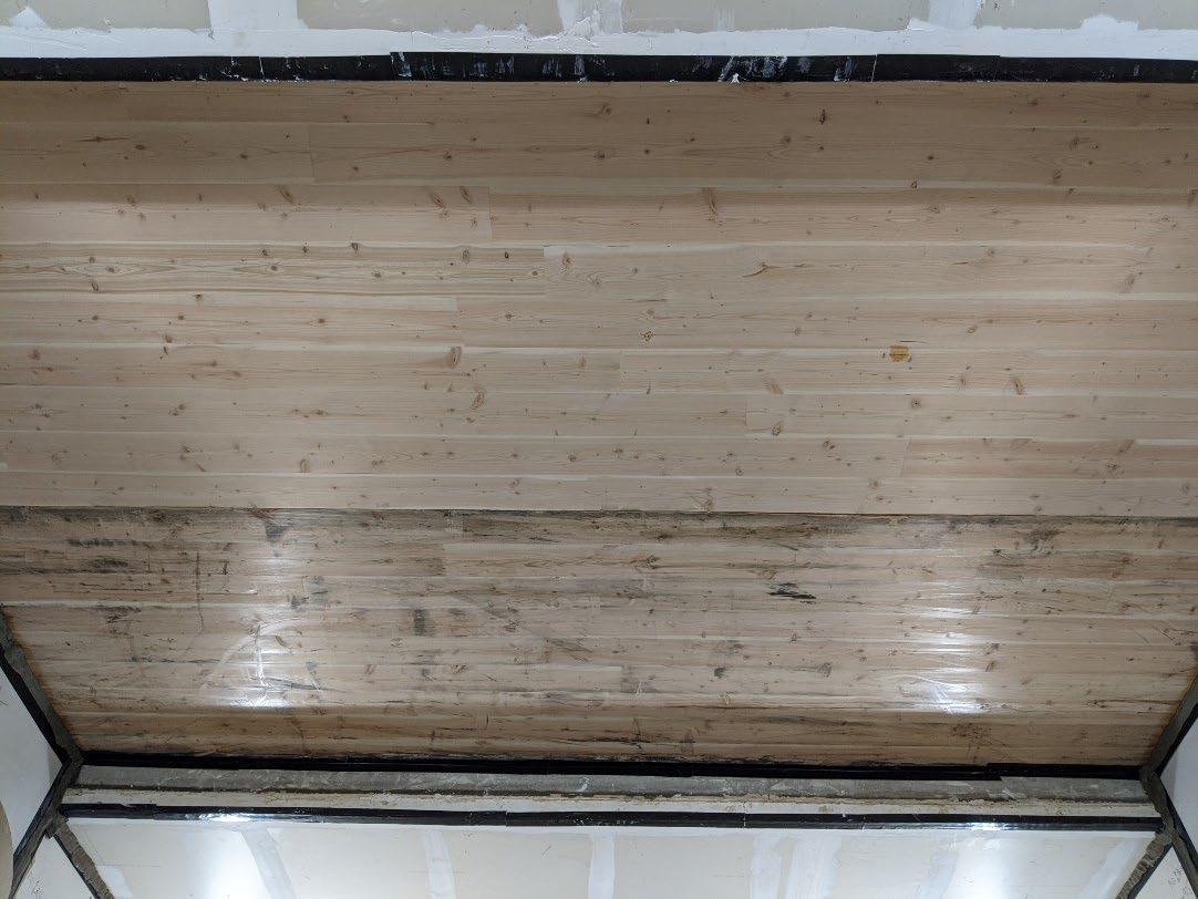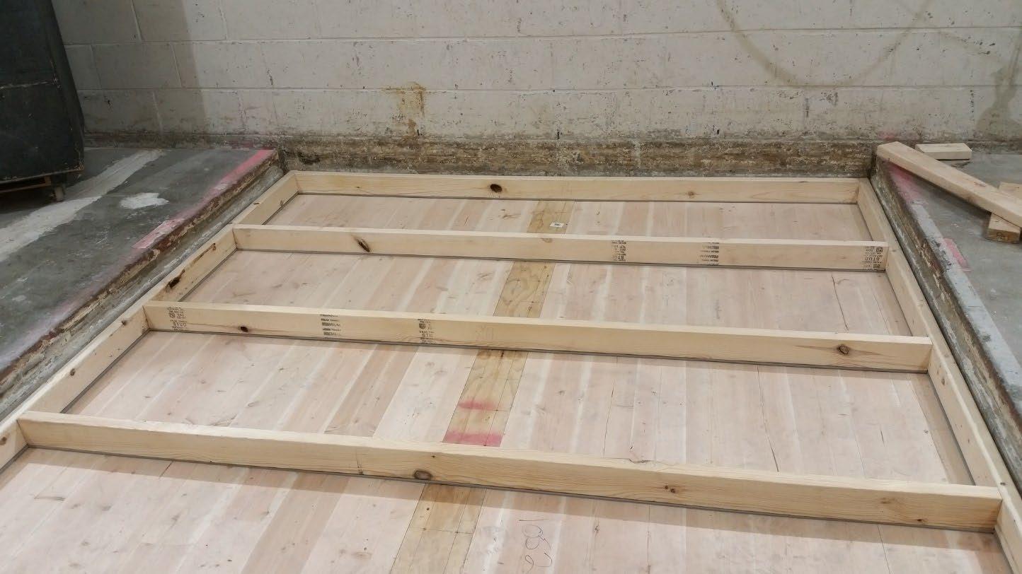 Tested assemblies were constructed with within the laboratory test chamber. The CLT layer of the tested assemblies was constructed of two panels, with the joint between panels running parallel to the long dimension. CLT panels were laid on 6” wide knee walls across the test opening and butted to one another without sealant or adhesive. Each of the two panels received a 3/4” x 3” rabbet on the top side where they abut, and were joined by a 3/4” x 6” plywood spline across the panel joint. This testing configuration is reflective of a typical configuration of CLT products within floor assemblies