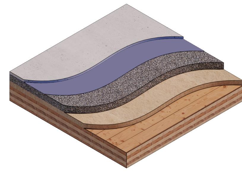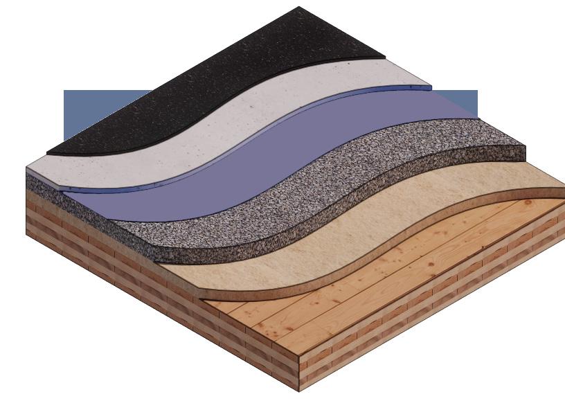 described in more detail in Section 02 of this report. All developed assemblies utilize 5-ply CLT panels as the wood substrate to provide a minimum baseline fire resistance regardless of sound attenuating materials added. For these remaining assembly layers, an emphasis was placed on bio-based, low-carbon, and easily disassembled materials in lieu of the more common mass timber floor assembly components that utilize synthetic or composite materials.