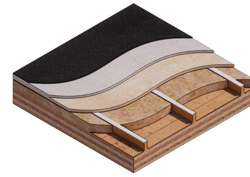 within. In the case of floor-ceiling assemblies, for aesthetic and biophilic reasons, it is common for designers working with mass timber products to expose the ceiling side of the timber structure, further limiting placement of most acoustic components to above the panel.7 These limitations set the parameters for developing unique solutions to address noise control in mass timber assemblies.