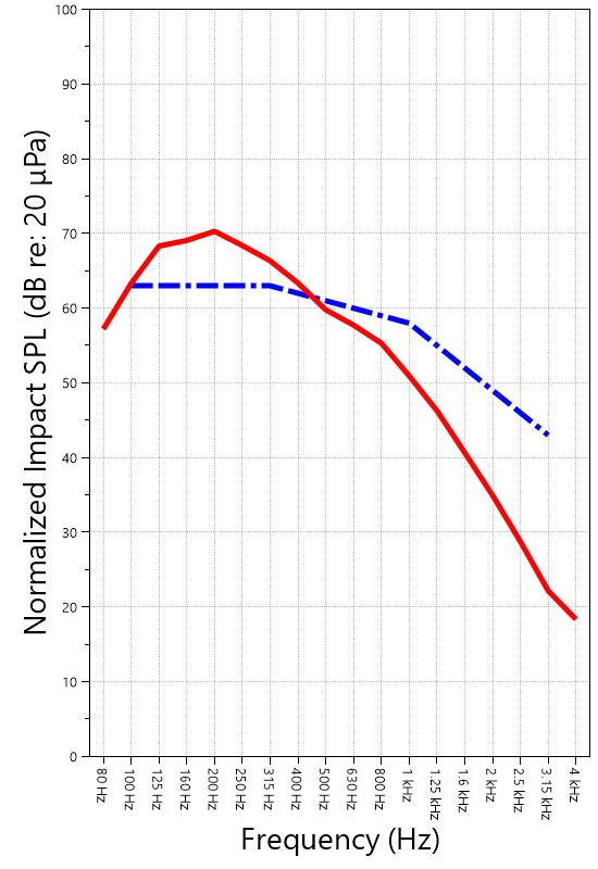 Specimen: Marmoleum Decibel adhered with Sustain 1195, 1-1/8” T&G plywood subfloor screwed 24” OC with #9x3", cavity filled with: HempWool Acoustibatt 3.5” hemp batt, 2x4 sleepers 24”OC with Rothoblaas Piano B acoustic strips stapled top/bottom, Vaagen Timbers 5-ply CLT 6.875” with plywood spline 3/4”x6” at the joint secured with #9x3” screws at 6” OC (See Full Report) Date