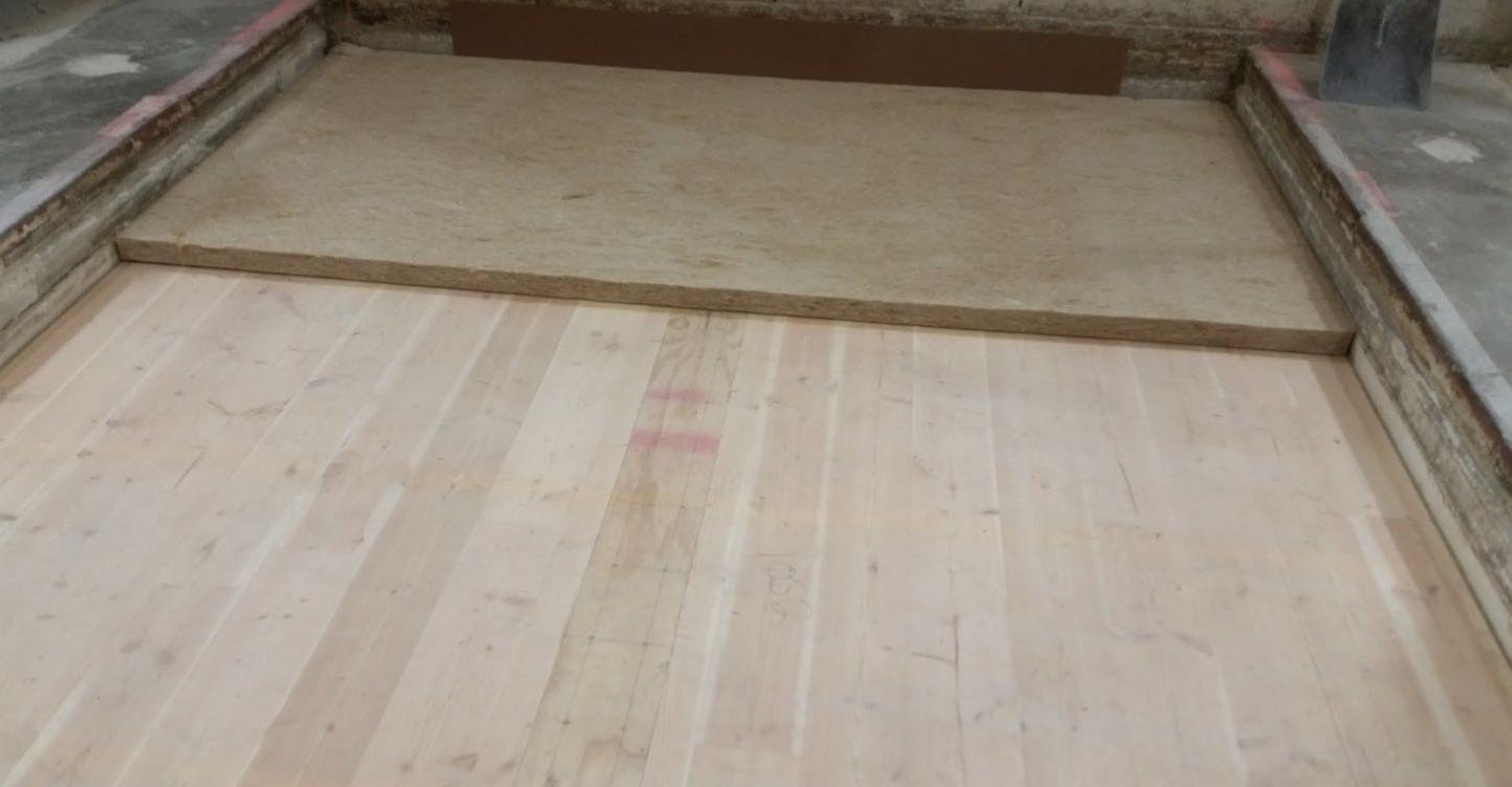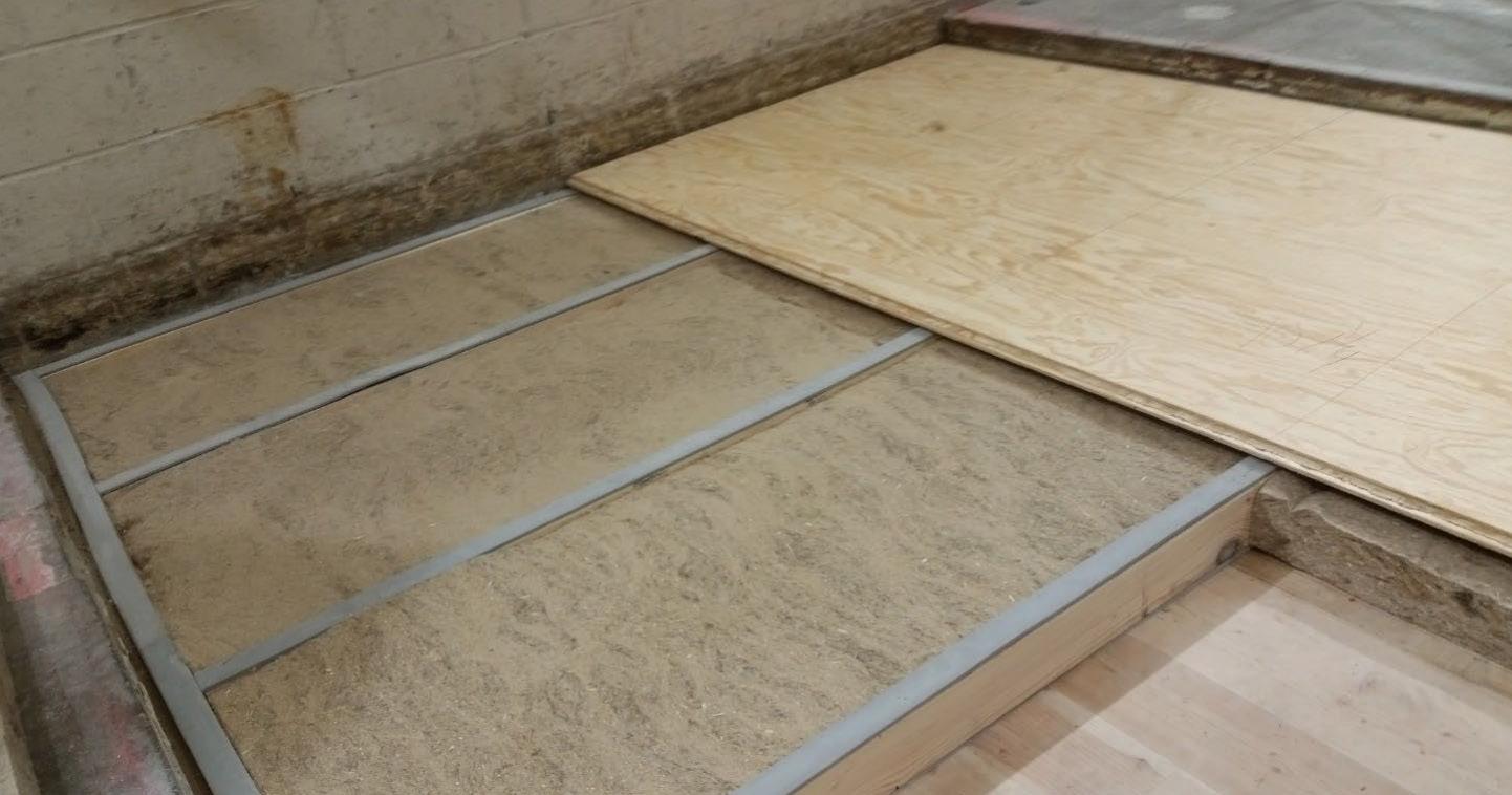 Marmoleum Decibel adhered with Sustain 1195, 1” Maxxon gypcrete 2000 Multifamily, 1-1/8” T&G plywood subfloor screwed 24” OC with #9x3”, cavity filled with: HempWool Acoustibatt 3.5” hemp batt, 2x4 sleepers 24”OC with Rothoblaas Piano B acoustic strips stapled top/bottom, Vaagen Timbers
