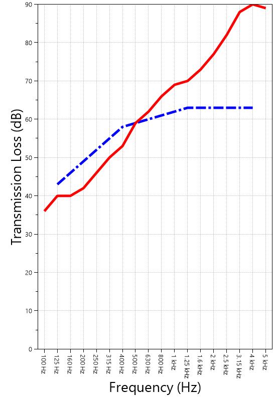 The determination of the Outdoor Indoor Transmission Class (OITC) as reported below was made with explicit conformity to the procedures described in the ASTM E1332-22 test standard. Test Method ASTM E90-09 (2016) was used to obtain the sound transmission loss data. This rating is based on an average transportation noise source spectrum and an A-weighted sound level reduction, either of which may be inappropriate for some applications. One-third Octave Band Center Frequency, Hz Reference Sound Spectrum,