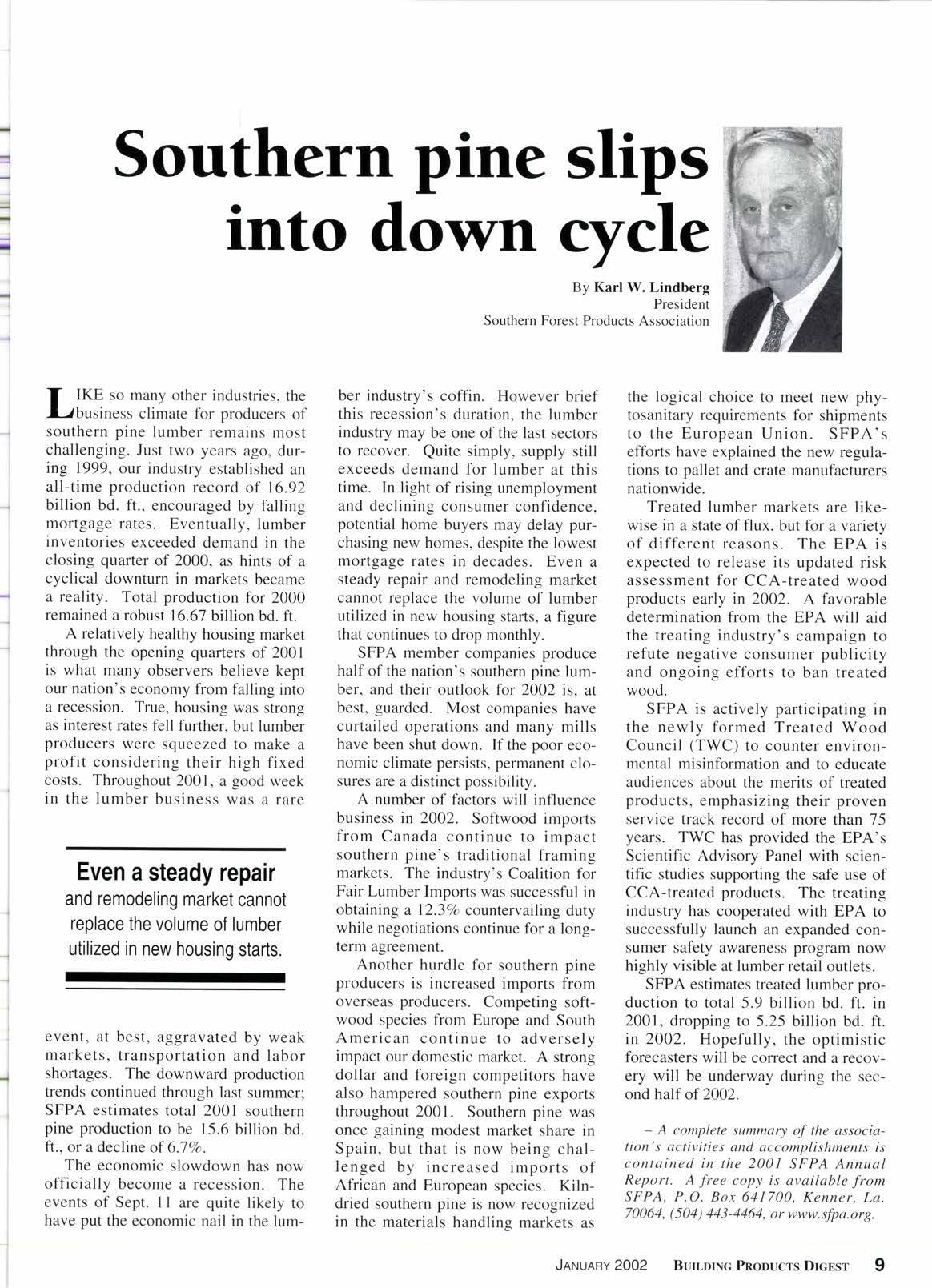 A relatively healthy housing market through the opening quarters of 2001 is what many observers believe kept our nation's economy from falling into a recession. True. housing was strong as interest rates fell further, but lumber producers were squeezed to make a profit considering their high fixed costs. Throughout 2001, a good week in the lumber business was a rare ber industry's coffin. However brief this recession's duration, the lumber industry may be one of the last sectors to recover. Quite simply, supply still exceeds demand for lumber at this time. In light of rising unemployment and declining consumer confidence, potential home buyers may delay purchasing new homes, despite the lowest mortgage rates in decades. Even a steady repair and remodeling market cannot replace the volume of lumber utilized in new housing starts, a figure that continues to drop monthly. the logical choice to meet new phytosanitary requirements for shipments to the European Union. SFPA's efforts have explained the new regulations to pallet and crate manufacturers nationwide. best, aggravated by weak markets, transportation and labor shortages. The downward production trends continued through last summer; SFPA estimates total 2001 southern pine production to be 15.6 billion bd. ft., or a decline of 6.lVo.
