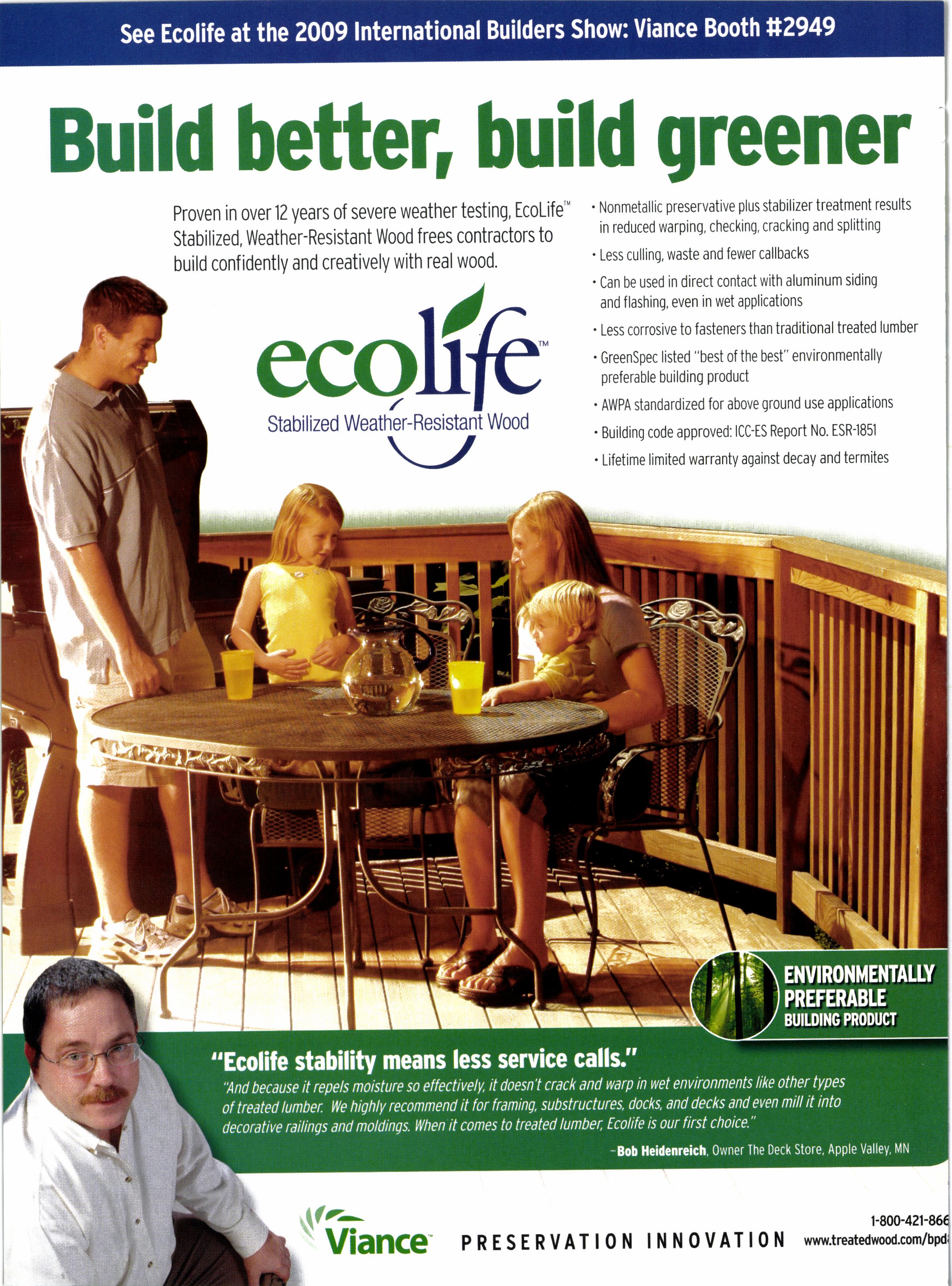 Proven in over 12 years of severe weather testing, Ecolife" Stabilized, Weather-Resistant Wood frees contractors to build confidently and creatively with real wood.