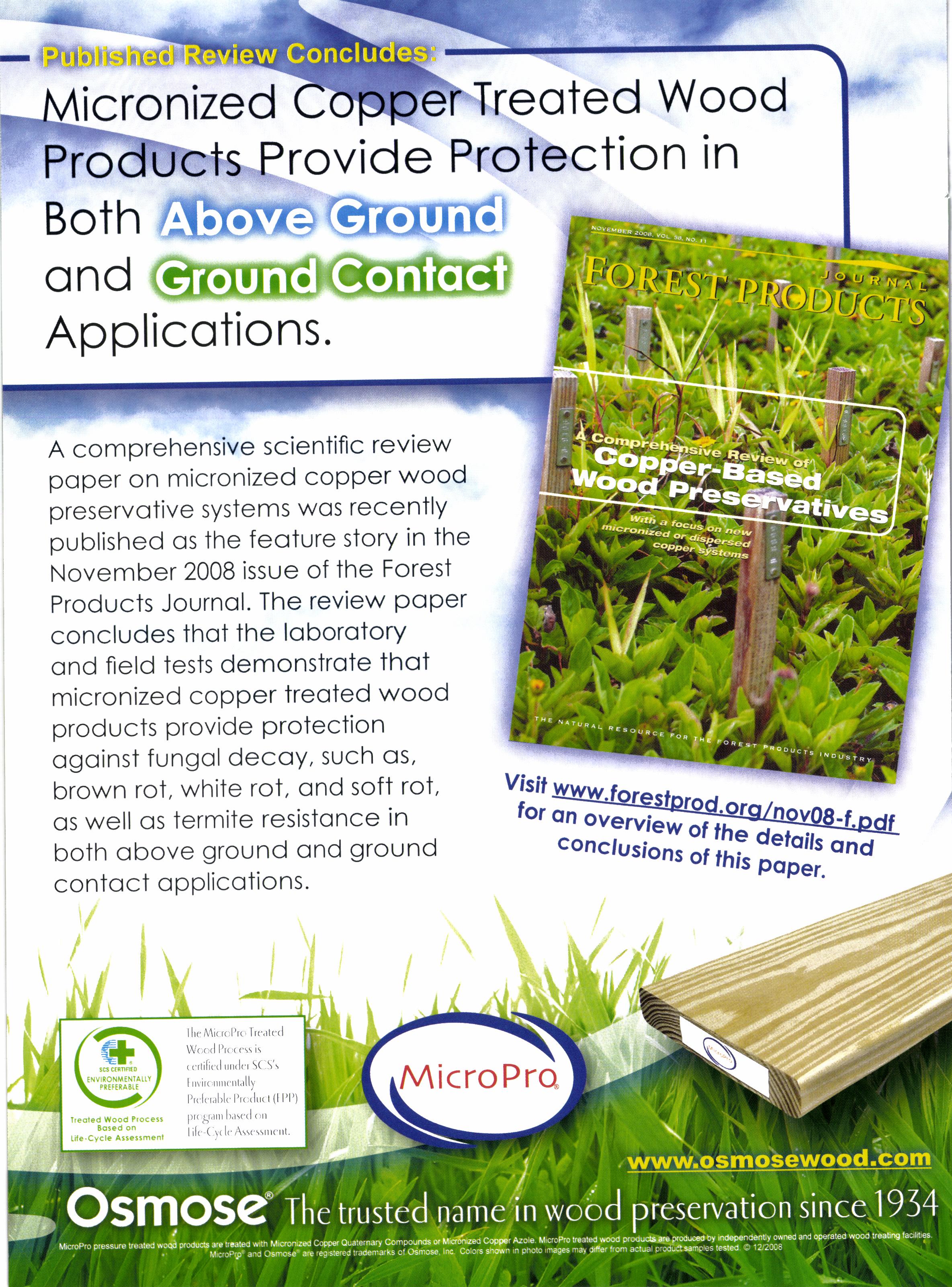 A comprehensive scientific review poper on micronized copper wood preservotive systems wos recently oublished os the feoture story in the November 2008 issue of the Forest Products Journol. The review poper concludes thot the loborotorY ond fleld tests demonstroie thct micronized coPPer treoted wood products provide Protection ogoinst fungol decoY, such os, brown rot, white rot, ond soft rot, os well os termite resistonce in both obove ground ond ground contoct oPPlicotions.