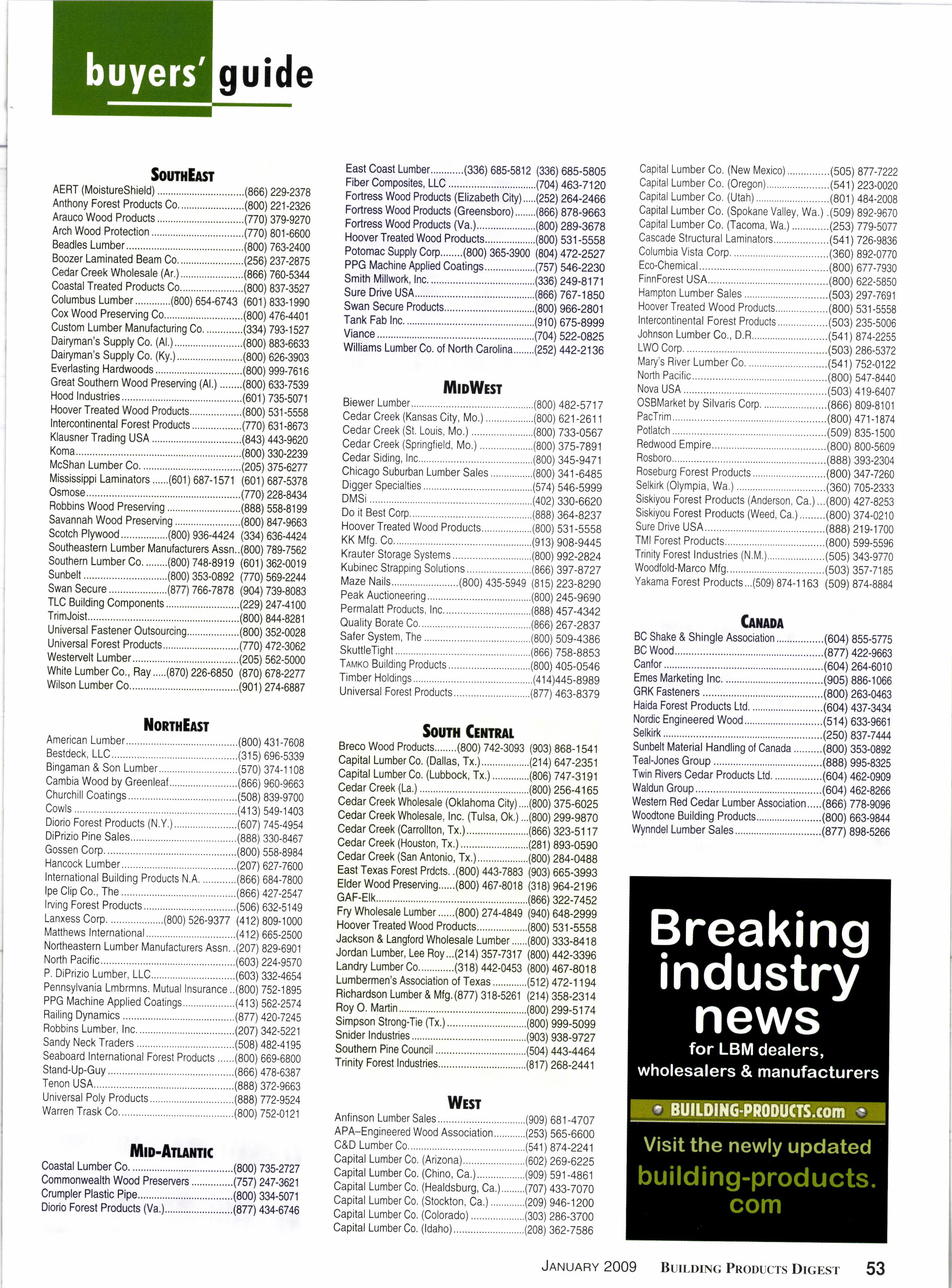 American Lumber... ......(900) 431.7608 Bestdeck, 11C........ ......(315) 696-5339 Bingaman & Son 1umber.,.......................,...(570) 374-1 1 08 Cambia Wood by Greenleaf ......,........,,........(866) 960-9663 Churchill Coatings.. ......(S08) 839-9700 C0w1s..................... ......(413) 549-1403 Diorio Forest Products (N.y.)...,............. ......(607\ 745-4954 DiPrizio Pine Sales. ......(888) 330-8467 Gossen C0rp.......,,. ......(800) 558-8984 Hancock Lumber.... ......(207\ 627-7600 International Building Producls N.A. ..........,,(866) 684-7800 lpe Clip Co., The...,,.......,..,......... .................866\ 427-2547 lrving Forest Products...,..........,...................(506) 632-5149 Lanxess Corp. ...........,,......(800) 526-9377 (412) 809-1000 Matthews Internationa|...........,.,........,,.........(412) 665-2500 Northeastern Lumber Manufacturers Assn..(207) g29-6901 North Pacific........... ,.....(603) 224-9570