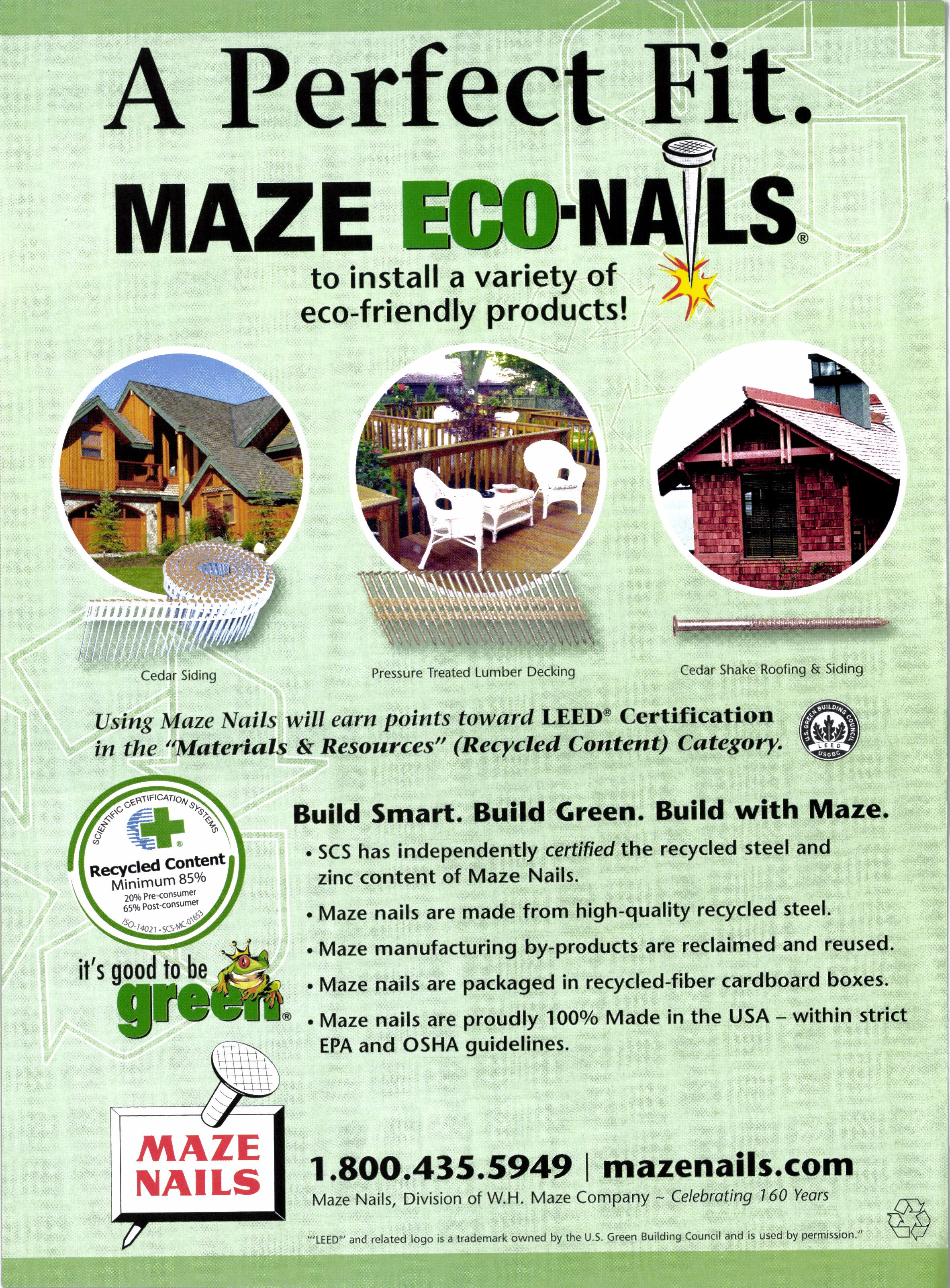 A Perfect Fit. s. Cedar Siding (lsing Mctze Nsils will earn points toward LEED@ Certification in the "Materials & Resources" (Recycled Cantent) Category. Build Smart. Build Green. Build with Maze. . SCS has independently certified the recycled steel and zinc content of Maze Nails. . Maze nails are made from high-quality recycled steel. Maze manufacturing by-products are reclaimed and reused. Maze nails are packaged in recycled-fiber cardboard boxes. . Maze nails are proudly 100o/o Made in the USA - within strict EPA and OSHA guidelines. 1.8OO .435.5949 | mazenails.com Maze Nails, Division of W.H. Maze Company - Celebrating 160 Years ',,LEED ,and related loqo is a trademark owned by the U.S. Green Building Council and is used by permtsston IF ]UIAZ;E EGO.N to install a variety of eco-friendly products! [@