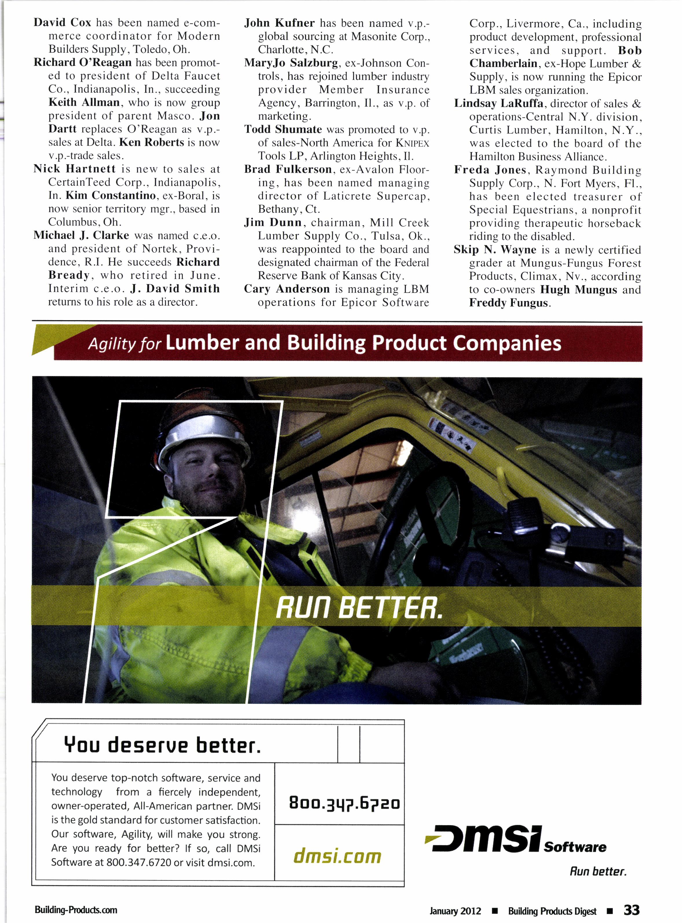 Corp., Livermore, Ca., including product development, professional services, and support. Bob Chamberlain, ex-Hope Lumber & Supply, is now running the Epicor LBM sales organization.