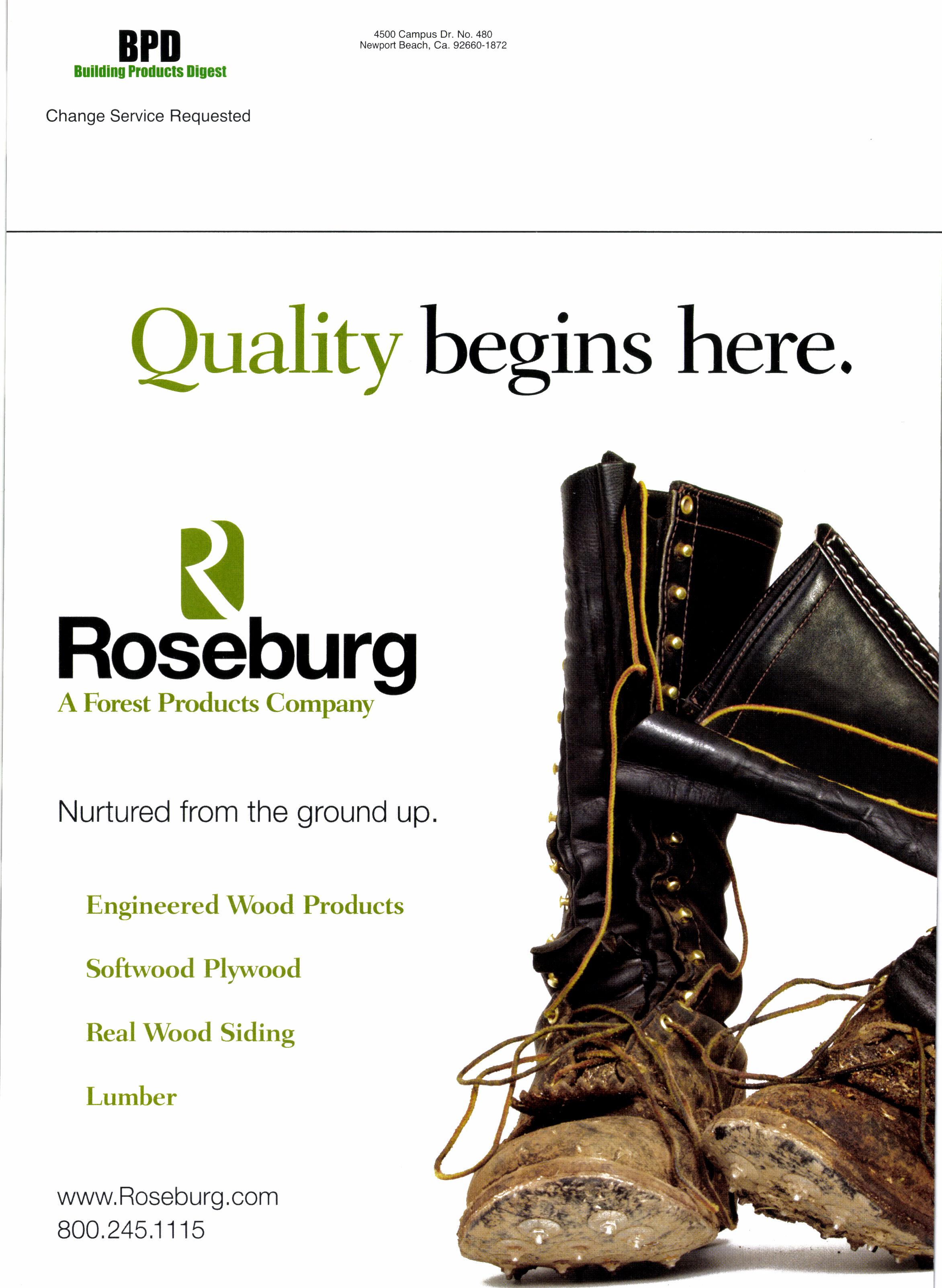 BPII Building Products 0igGst Change Service Requested 4500 Campus Dr. No. 480 Newoort Beach. Ca. 92660-1872 Qualitybegins here. , N Rosbburg A Forest Products Corrrpt ryt Nurtured from the ground up. Engineered Wood Products Softwood Plywood Real Wood Siding Lumber www. Roseburg.com 800.245.1115