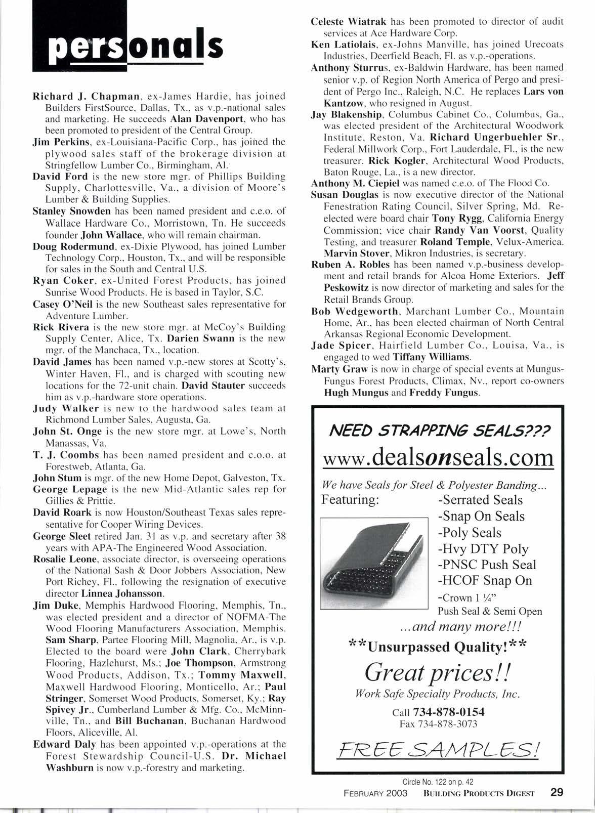 Richard J. Chapman, ex-James Hardie, has joined Builders FirstSource, Dallas, Tx., as v.p.-national sales and marketing. He succeeds Alan Davenport, who has been promoted to president of the Central Group.