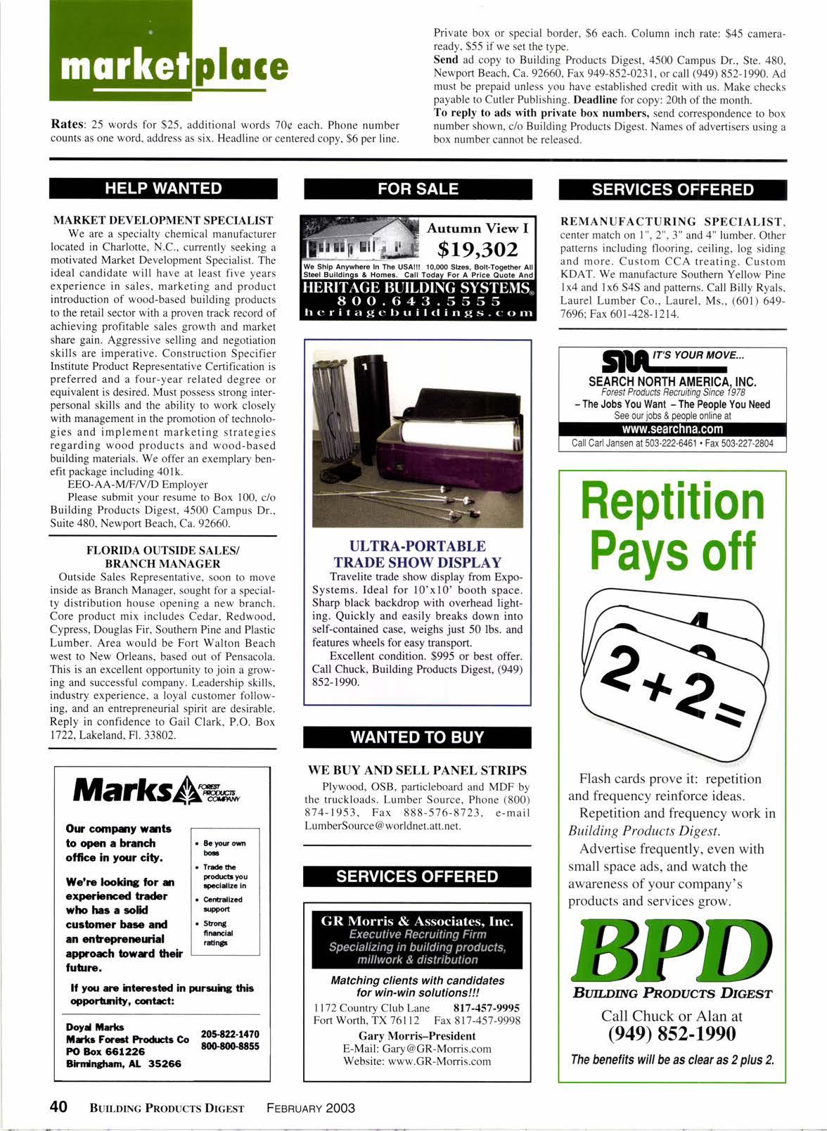 To reply to ads with private box numbers, send correspondence to box number shown, c/o Building Products Digest. Names of advertisers using a box number cannot be released.