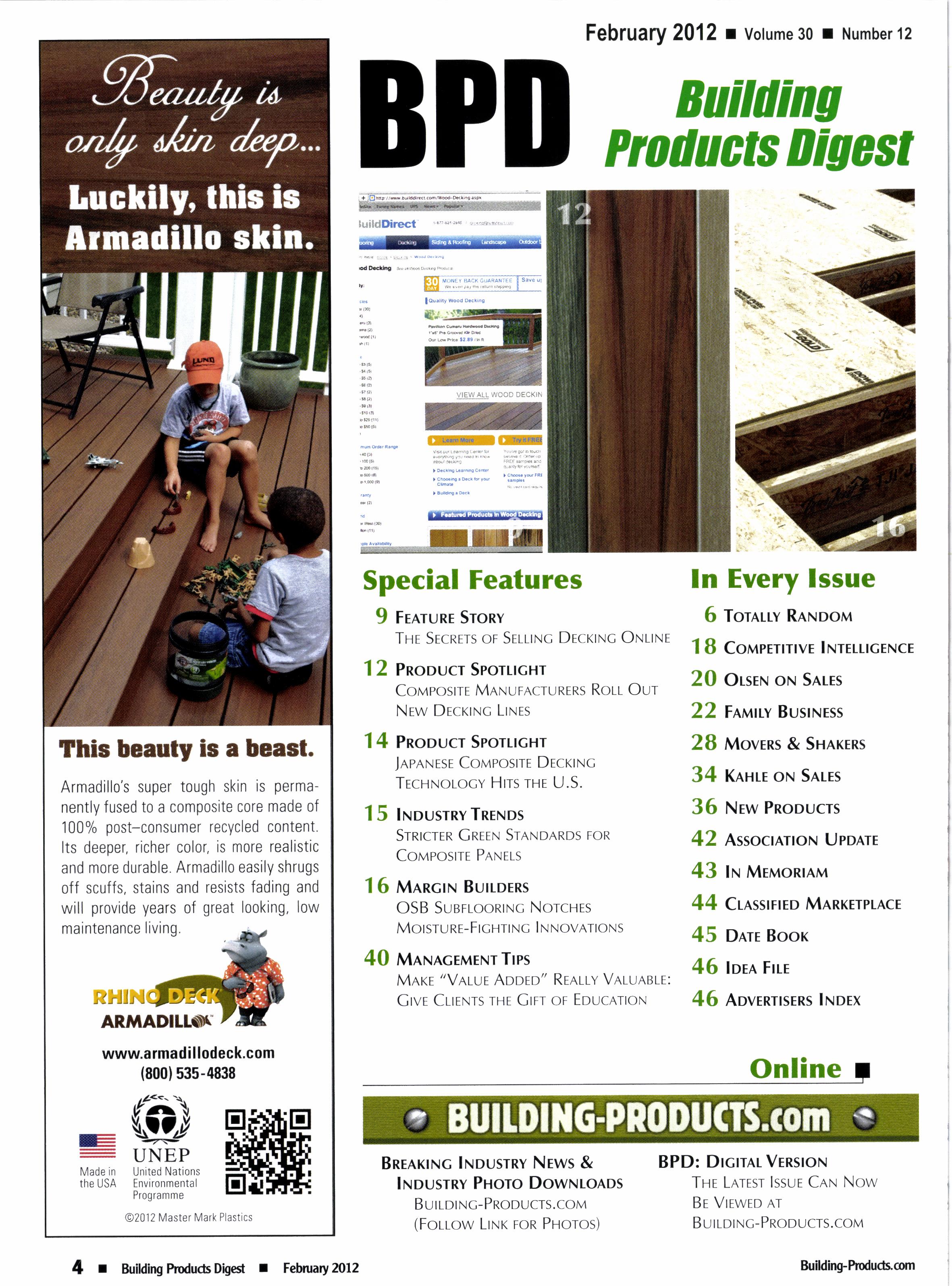 9 Frnrunr Sronv THr Srcnrrs or SElrtNc DrcrtNc ONrtNr 12 Pnooucr Sporlrcnr Covrposrrr MnNurncrunrns Rolr Our NEw DrcrtNc LtNrs 14 Pnooucr Sporucnr JnpnNesr Covpostrr DrcrtNc TecHNorocY Htrs rHr U.S. 'l 5 lrrrousrnv Tnrnos Srnrcrrn CneeN STnNoARDS FoR Co,vtpostre PnNrrs 16 MnncrN Butorns OSB SuerroontNc NorcHrs Morsrune-FtcHrtNc I NNovATtoNS 40 MaNncrmrNr Trps MAKE "VALUE ADDED" Rrnrrv VRrunsLe : Grvr CltrNrs rHr Ctrr or EoucnrtoN Bnrnxrrc lnousrnv Nrws & I nousrnv PHoro DowHI-onos B urrorNc-PnoDUCTS.coM (Forrow LrNr ron Puoros) BPD: Drcrrnl Vrnstott THr Lnrrsr lssur CnN Now Be Vrrwro Rr B u rrorNc-PnoDUCTS.coM February 2012 r volume 3o r Number 12 BuililinA Pr0iluils Digest\ 6 Tomllv Rnruoou 1 B Coruprrrnvr lNrttucENcE 20 oLsrN oN Snlrs 22 Fruww BusrNrss 28 Movrns & Snnrrns 34 KauLr oru Srlrs 36 Nrw Pnooucrs 42 AssocrnnoN Uporrr 43 lN Mrmonrnpr 44 cr-nssrnro Mnnxrrpucr 45 Dnrr Boor 46 lorr Frlr 46 Aovrnlsrns lHorx