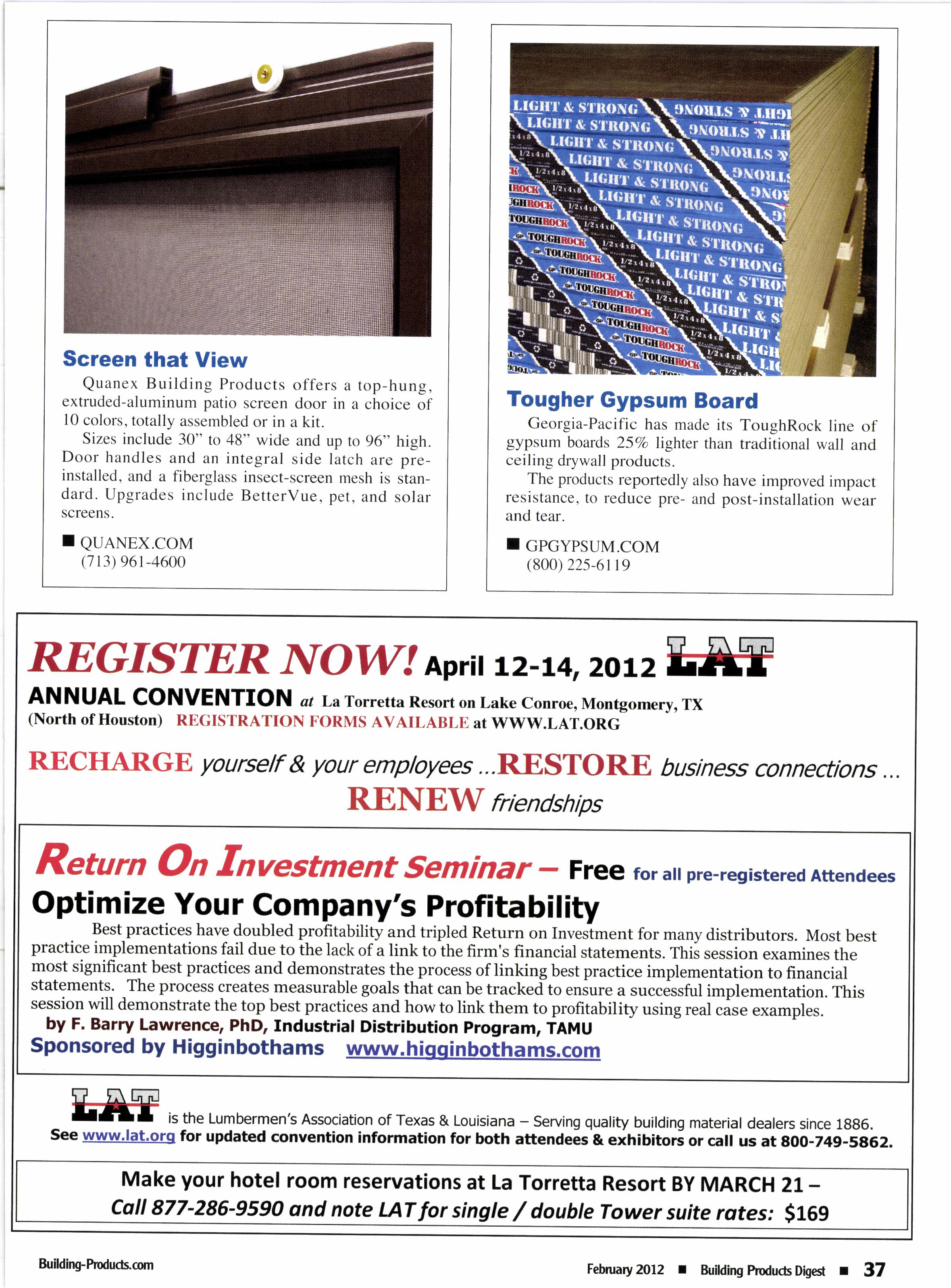 BUILDING PR0DUCTS DIGEST is published monthly at 4500 Campus Dr., Ste. 480, Newport Beach, Ca. 92660-1872, (949) 852-1990, Fax 949-852-023'1, www.buildingproducts.com, by Cutler Publishing, Inc. (a California Corporation). lt is an independently owned publication for building products retailers and wholesale distributors in 37 states East of the Rockies. Copyright@2012 by Cutler Publishing, Inc. Cover and entire contents are fully protected and must not be reproduced in any manner without written permission. All Rights Reserved. BPD reserves the right to accept or reject any editorial or advertising matter, and assumes no liabilitv for materials furnished to it.
