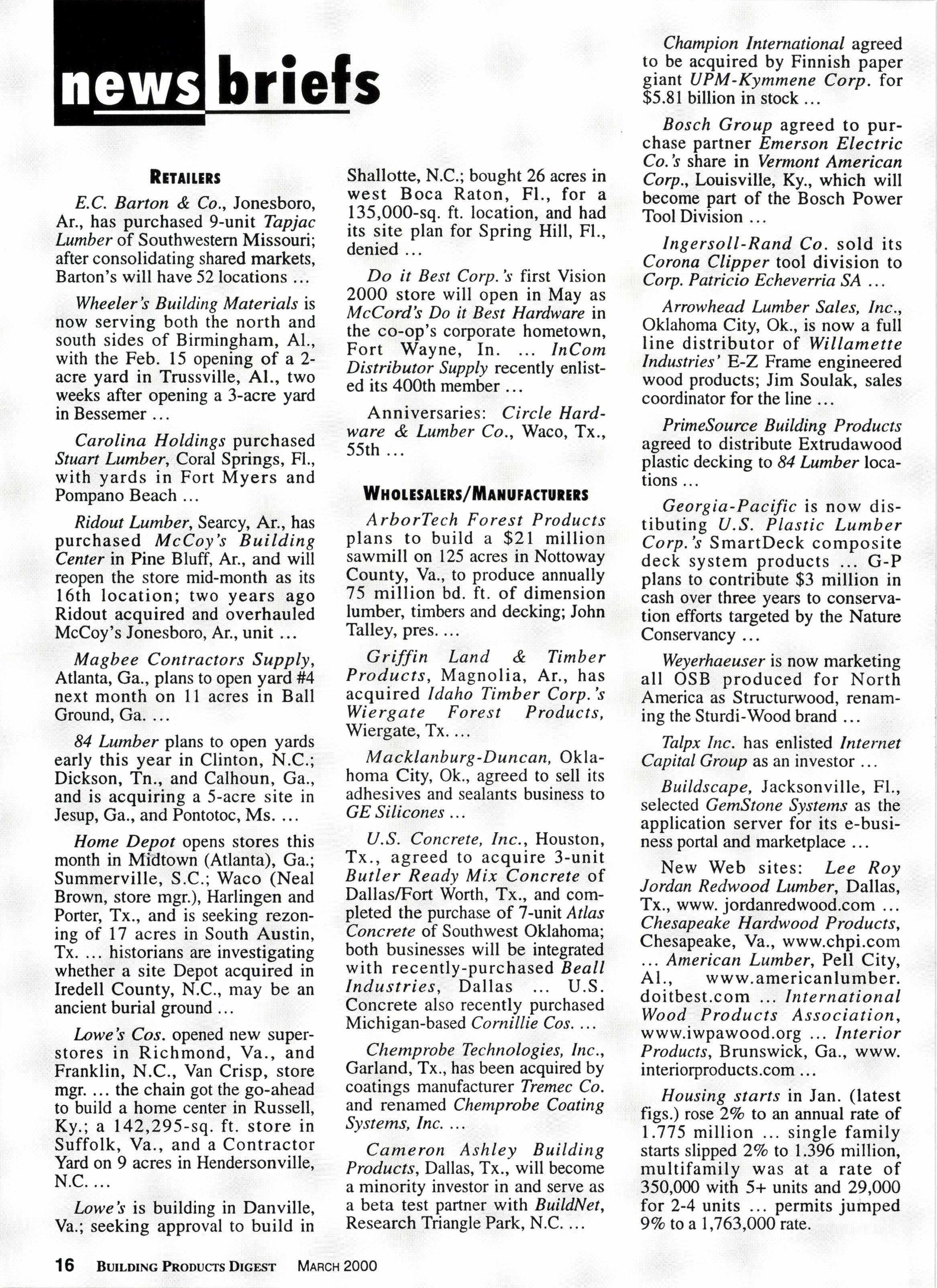 E.C. Barton & Co., Jonesboro, Ar., has purchased 9-unit Tapjac Lumber of Southwestern Missouri; after consolidating shared markets, Barton's will have 52 locations ...