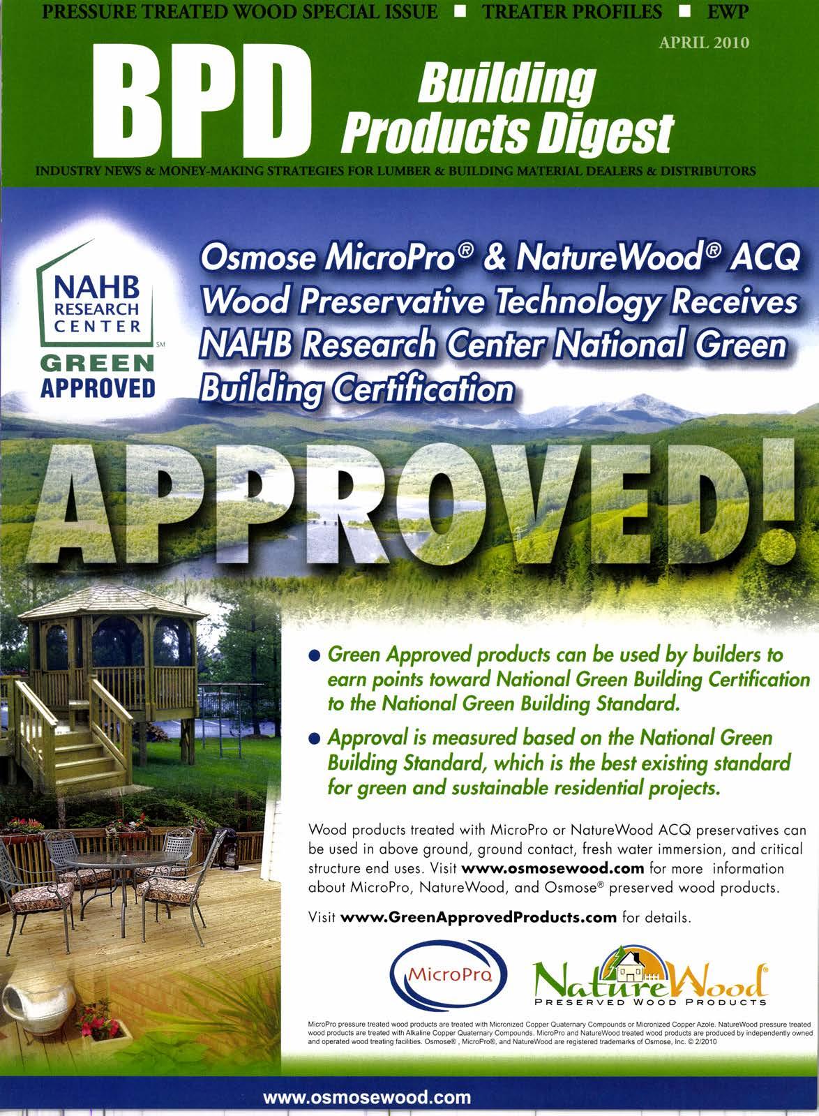 Wood products treoted with MicroPro or NotureWood ACQ preservotives con be used in obove ground, ground contoct, fresh woter immersion, ond criticol structure end uses. Visit www.osmosewood.com for more informotion obout MicroPro, NotureWood, ond Osmose@ preserved wood products.