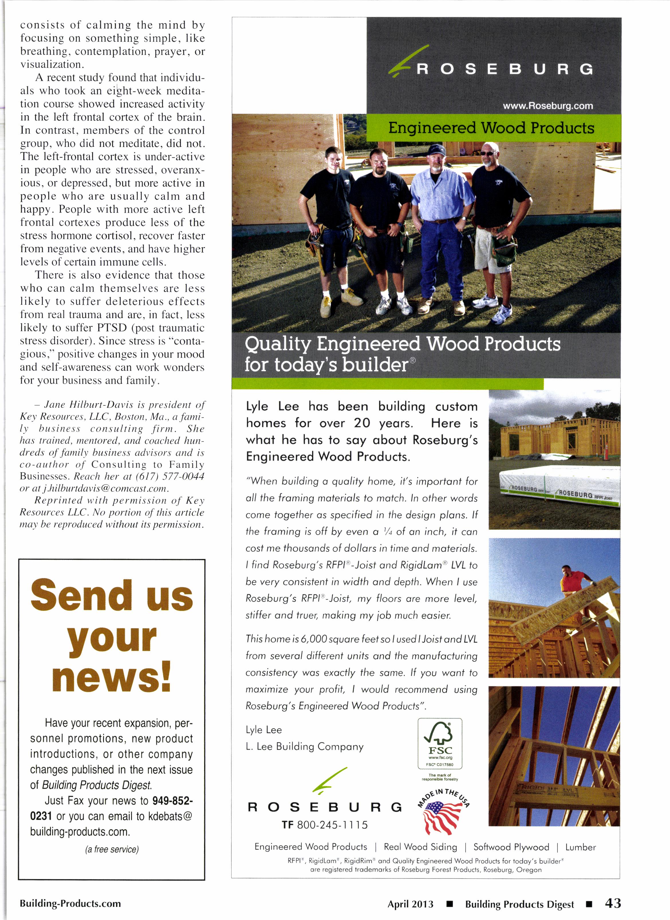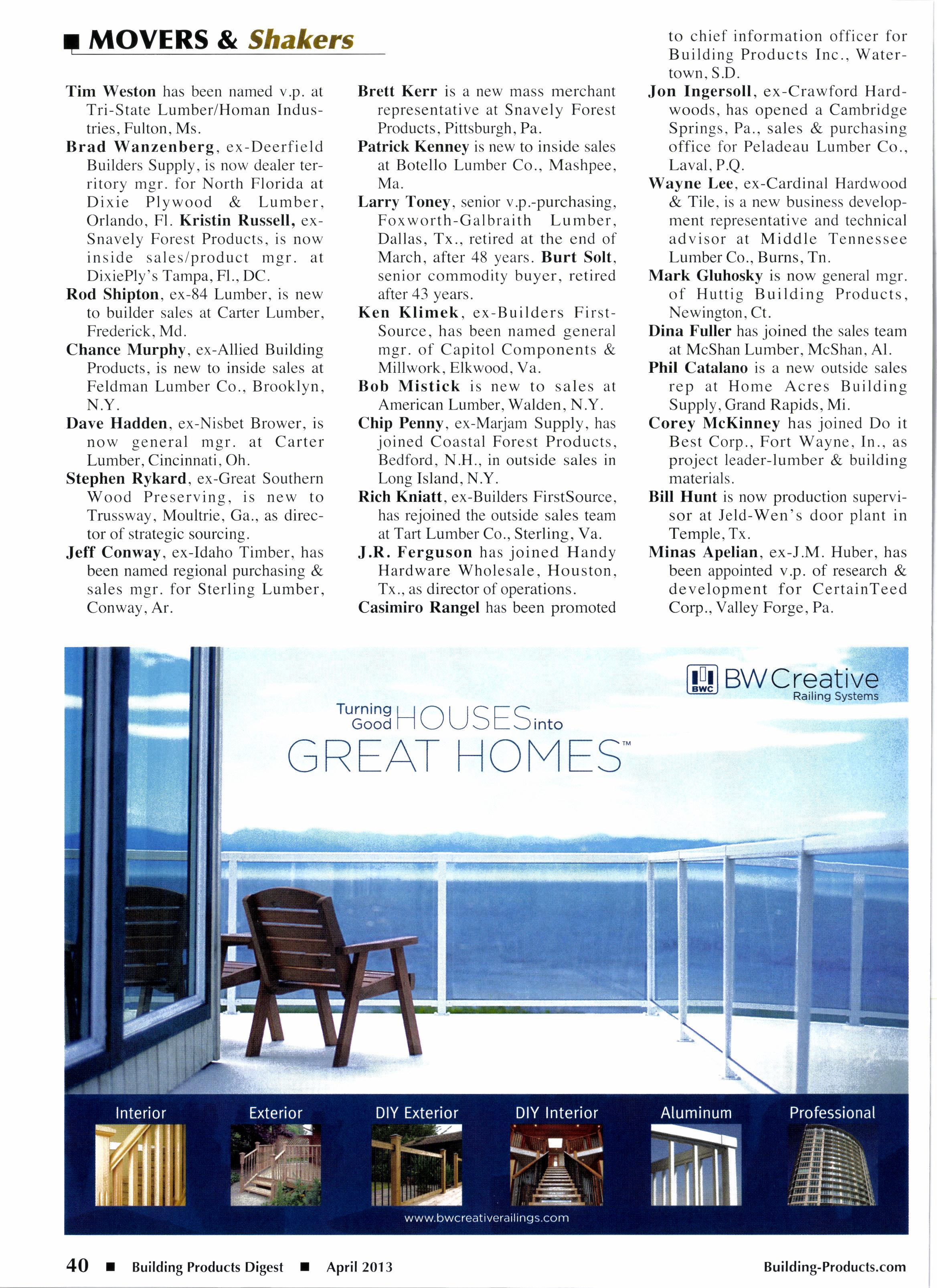 BUILDING PRODUCTS DIGEST is oublished monthly at 4500 Campus Dr., Ste.480, Newport Beach, Ca. 92660-1872, (949) 852-1990, Fax 949-852-0231, www.buildingproducts.com, by Cutler Publishing, Inc. (a California Corporation). lt is an independently owned publication for building products retailers and wholesale distributors in 37 states East of the Rockies. Copyright@20'13 by Cutler Publishing, Inc. Cover and entire contents are fully protected and must not be reproduced in any manner wilhout written permission. All Rights Reserved. BPD reserves the right to accept or reject any editorial or advertising matter, and assumes no liability for materials furnished to it.