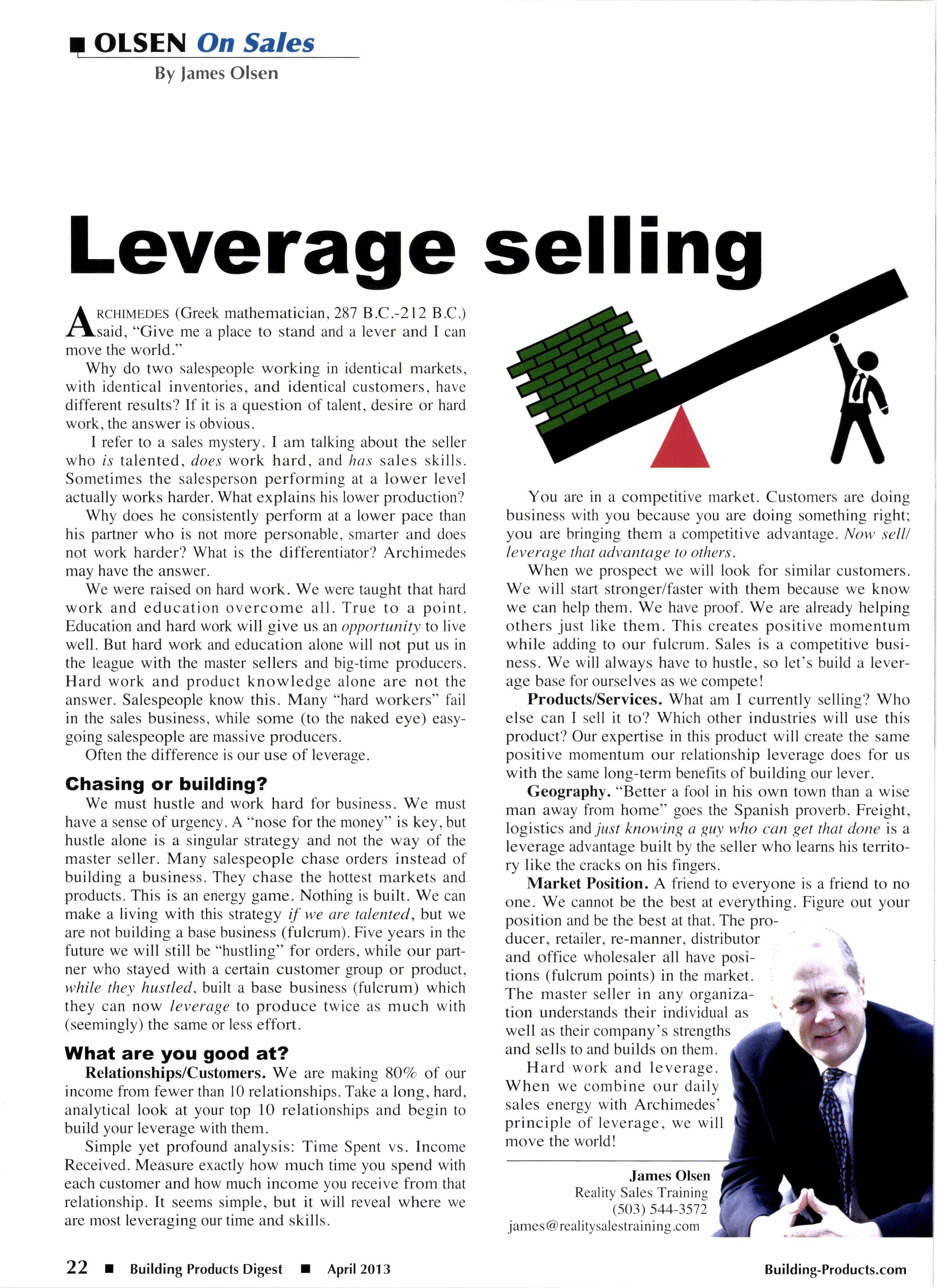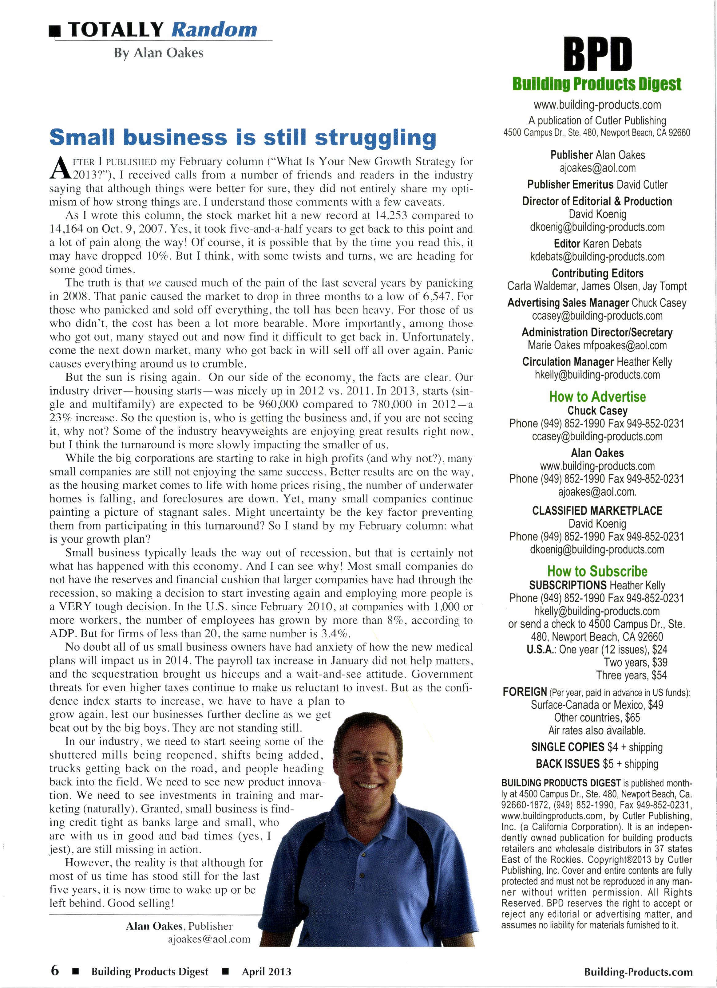But the sun is rising again. On our side of the economy, the facts are clear. Our industry driver-housing starts-was nicely up in 2012 vs. 2011. In 2013, starts (single and multifamily) are expected to be 960,000 compared to 780,000 in 2012-a 23Vo increase. So the question is, who is getting the business and, ifyou are not seeing it, why not? Some of the industry heavyweights are enjoying great results right now, but I think the turnaround is more slowly impacting the smaller of us.