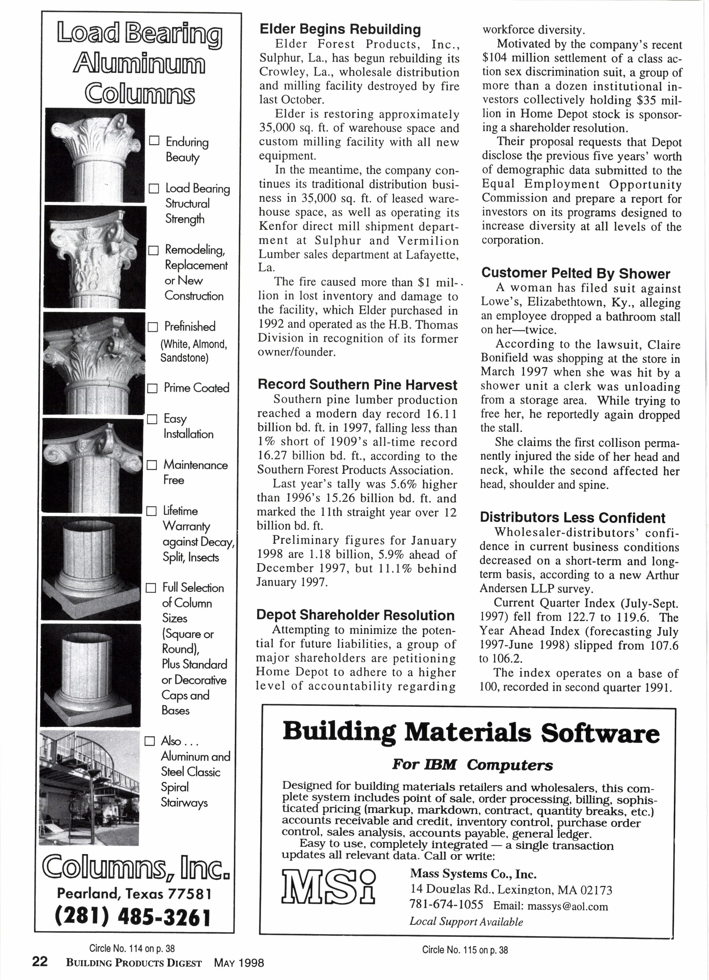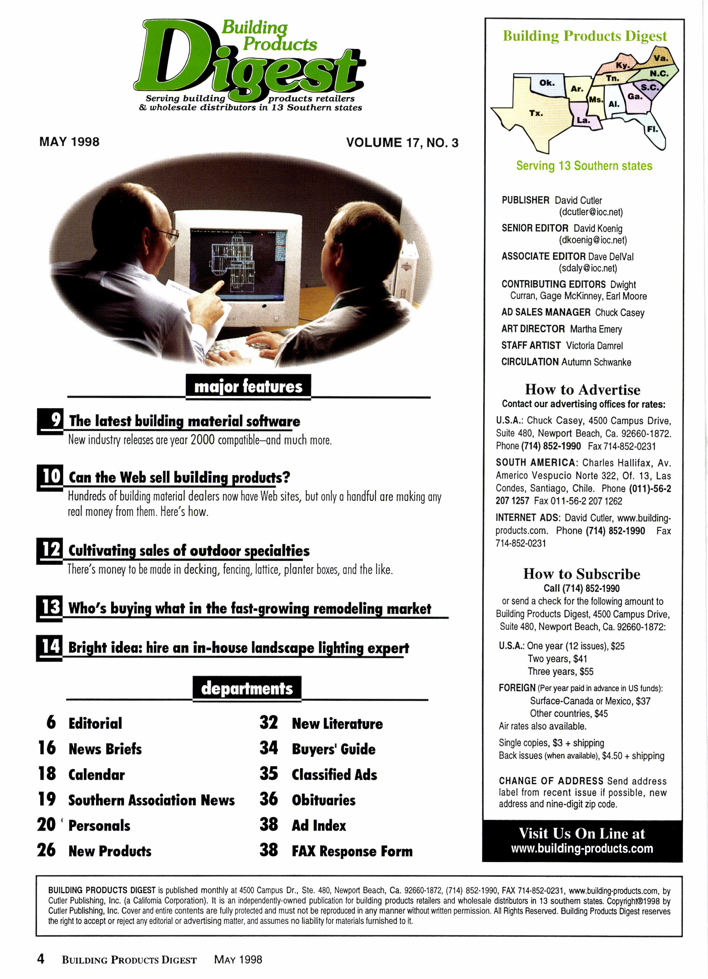 MAY 1998 5 Edirodol l6 ilervs Briefg l8 colendor l9 Soulhern Associqlion llews 20' Personals 26 ilew Productg voLUME 17, NO.3 llew literoture Buyerc'Guide Clcssified Ads Obituories Ad lndex IAX Response forn E n" t.r"tr lrtlltrg rt uch more. reol money from them. Here's how. lE f"n*"rt"l $.l "t, tThere's money lo be mode in decking, fencing, lotticq plonter boxes, ond the like. Can the ttteb sell Hundreds of building moteriol deolers now hove Web sites, but only o hondful ore mokng ony t2 34 35 36 38 38