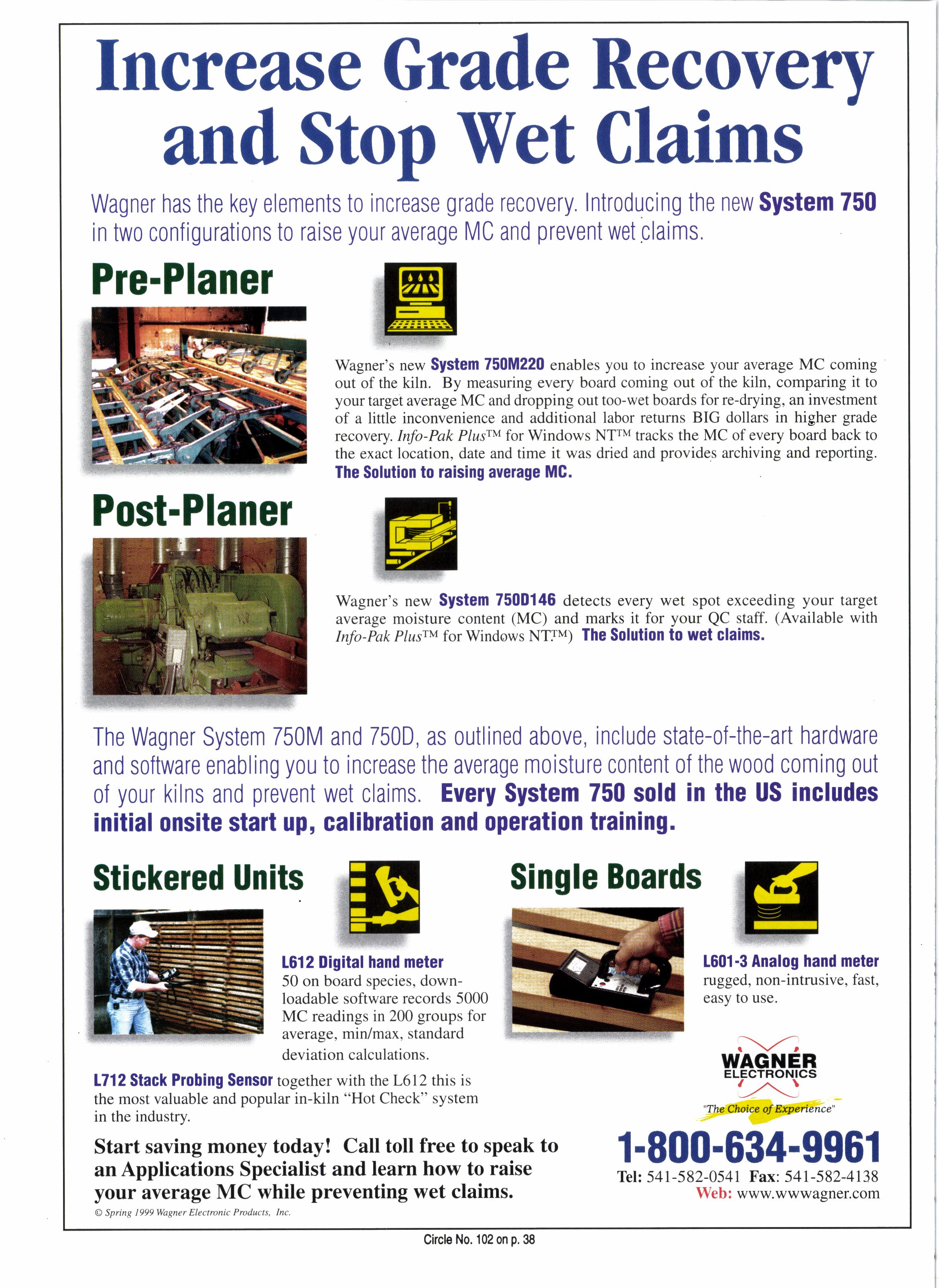 The Wagner System 750M and 750D, as outlined above, include state-of{he-art hardware and software enabling you to increase the average moisture content of the wood coming out of your kilns and prevent wet claims. Every System 750 sold in the US includes initial onsite stail up, caliblation and opetation ttaining.