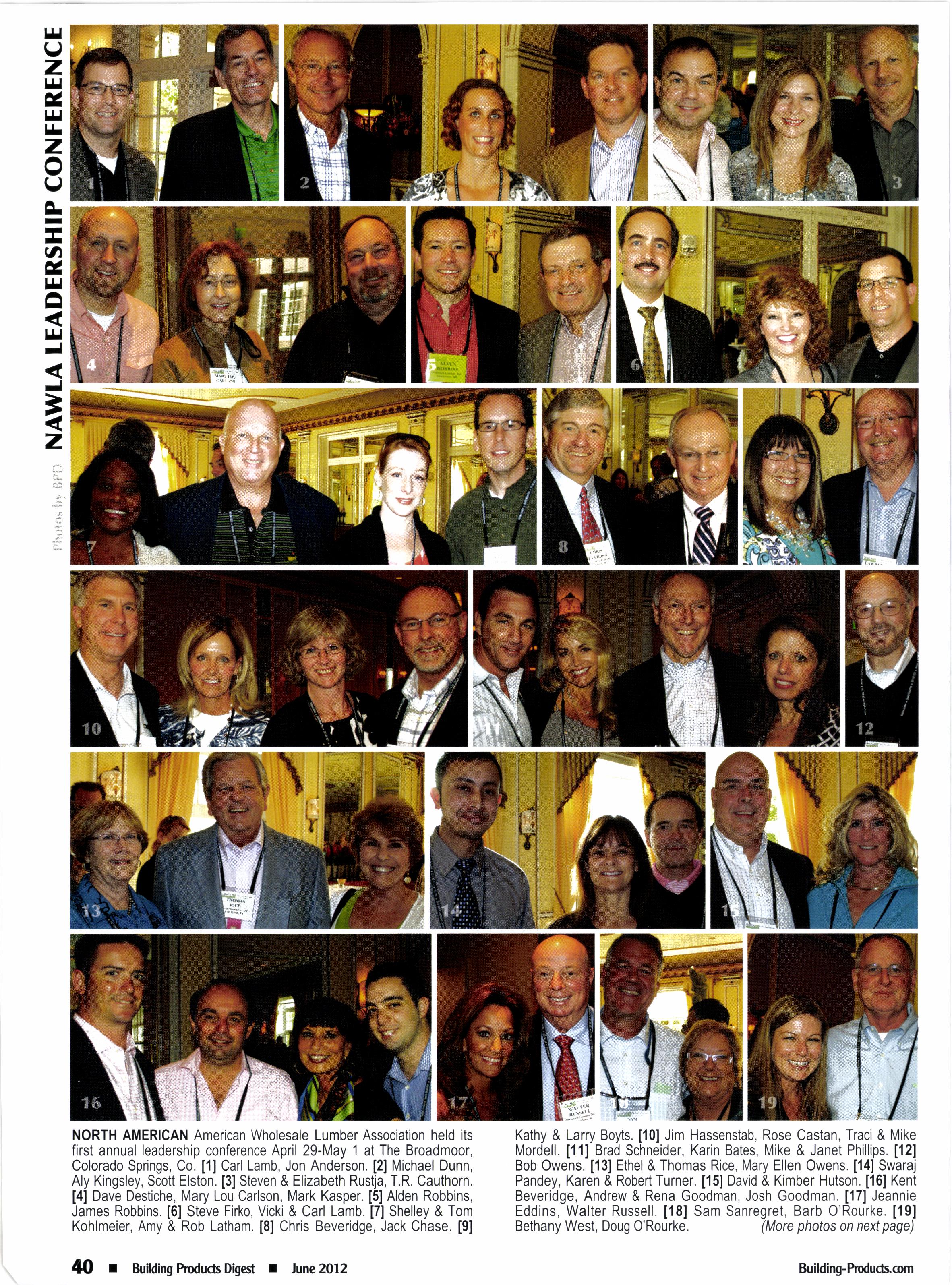 NORTH AMERICAN American Wholesale Lumber Association held its first annual leadership conference April 29-May 1 at The Broadmoor, Colorado Springs, Co. [1] Carl Lamb, Jon Anderson. [2] Michael Dunn, Aly Kingsley, Scott Elston. [3] Steven & Elizabeth Rustja, T.R. Cauthorn. [4] Dave Destiche, Mary Lou Carlson, Mark Kasper. [5] Alden Robbins, James Robbins. [6] Steve Firko, Vicki & Cad Lamb. [7] Shelley & Tom Kohlmeier, Amy & Rob Latham. [8] Chris Beveridge, Jack Chase. [9]