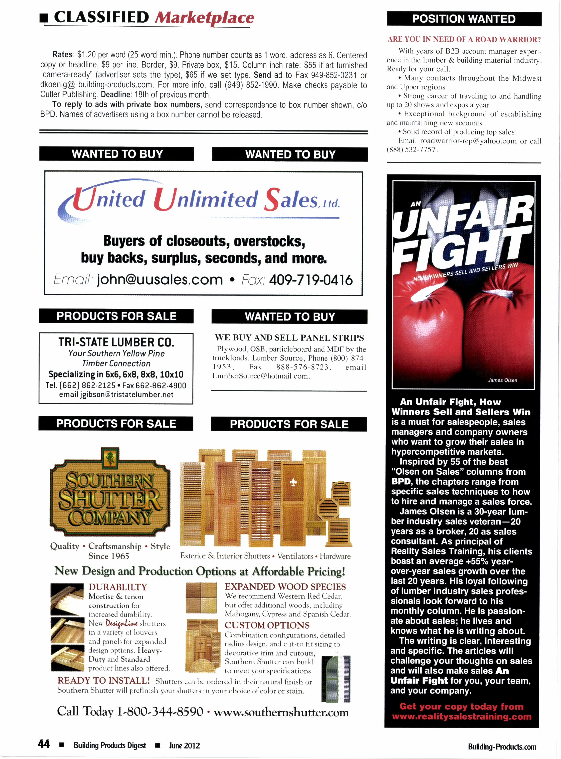 Rates: $1.20 per word (25 word min.). Phone number counts as 1 word, address as 6. Centered copy or headline, $9 per line. Border, $9. Private box, $15. Column inch rate: $55 if art furnished "camera-ready" (advertiser sets the type), $65 if we set type. Send ad to Fax 949-852-0231 or dkoenig@ building-products.com. For more info, call (949)852-1990. Make checks payable to Cutler Publishing. Deadline: 18th of previous month.