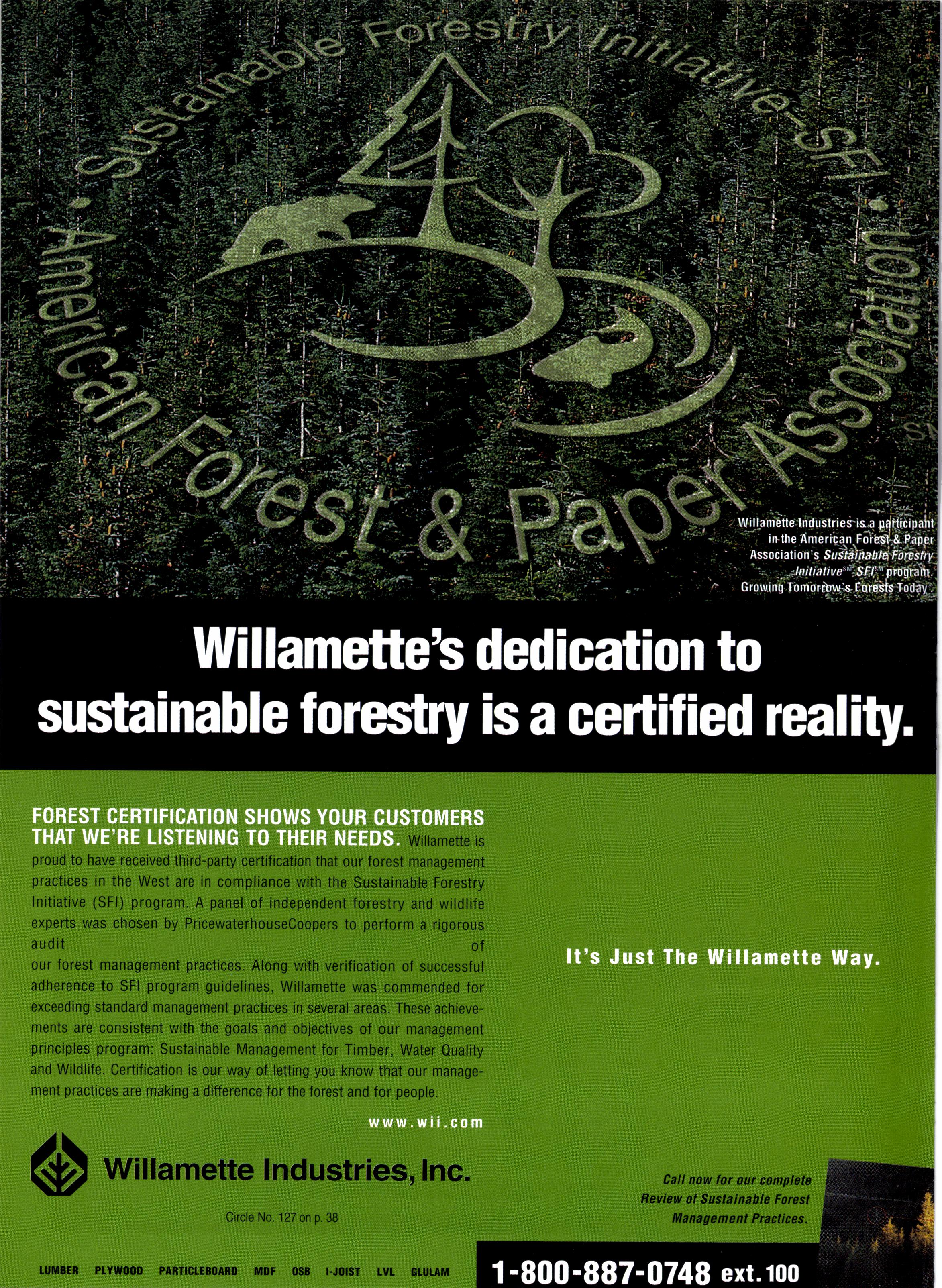Khrista Barnes Tracy Dan e s 912-367 Calder Stan lsom Wyatl SPann cJ1) Sand McNea 9r2Willamette is proud t0 have received third-party certification that our forest management practices in the West are in compliance with the Sustainable Forestry Initiative (SFl) program. A panel of independent forestry and wildlife experts was chosen by Pricewaterhouse0oopers to perform a rigorous audit of our forest management practices. Along with verification of successful adherence to SFI program guidelines, Willamette was commended for exceeding standard management practices in several areas. These achievements are consistent with the goals and objectives of our management principles pr0gram: Sustainable Management for Timber, Water Quality and Wildlife. Certification is our way of letting you know that our management practices are making a difference for the forest and for people.