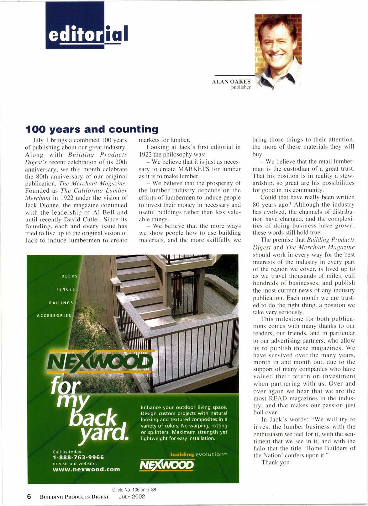 July l brings a combined 100 years of publishing about our great industry. Along with Building Products Digest's recent celebration of its 20th anniversary, we this month celebrate the 80th anniversary of our original publication, The Merchant Magazine. Founded as The California Lumber Merchant in 1922 under the vision of Jack Dionne, the magazine continued with the leadership of Al Bell and until recently David Cutler. Since its founding, each and every issue has tried to live up to the original vision of Jack to induce lumbermen to create