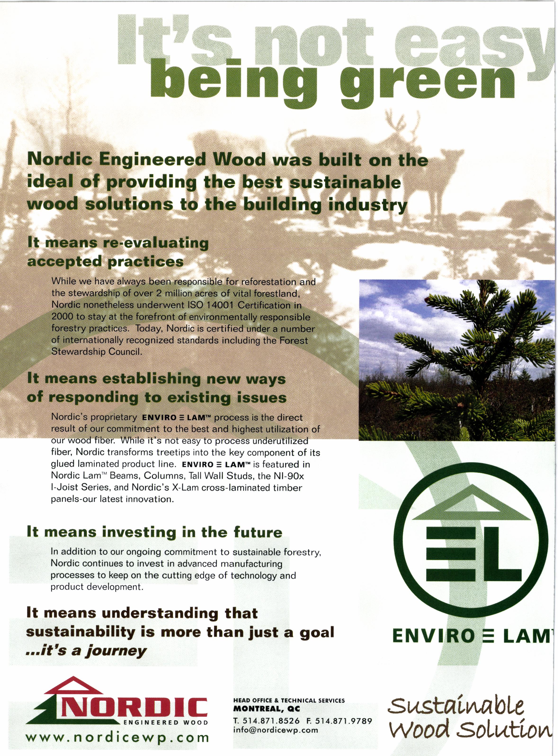 Nordic's proprietary Exvtno = lnnd':,jliaeess is the direct result of our commitment to the best and highest utilization of our wood fiber. While it's not easy to process underutilized fiber, Nordic transforms treetips into the key component of its glued laminated product line. ENVtRo = LAMrs is featured in Nordic Lam"'Beams, Columns, Tall Wall Studs, the Nl-9ox I Joist Series, and Nordic's X-Lam cross-laminated timber panels-our latest innovation.