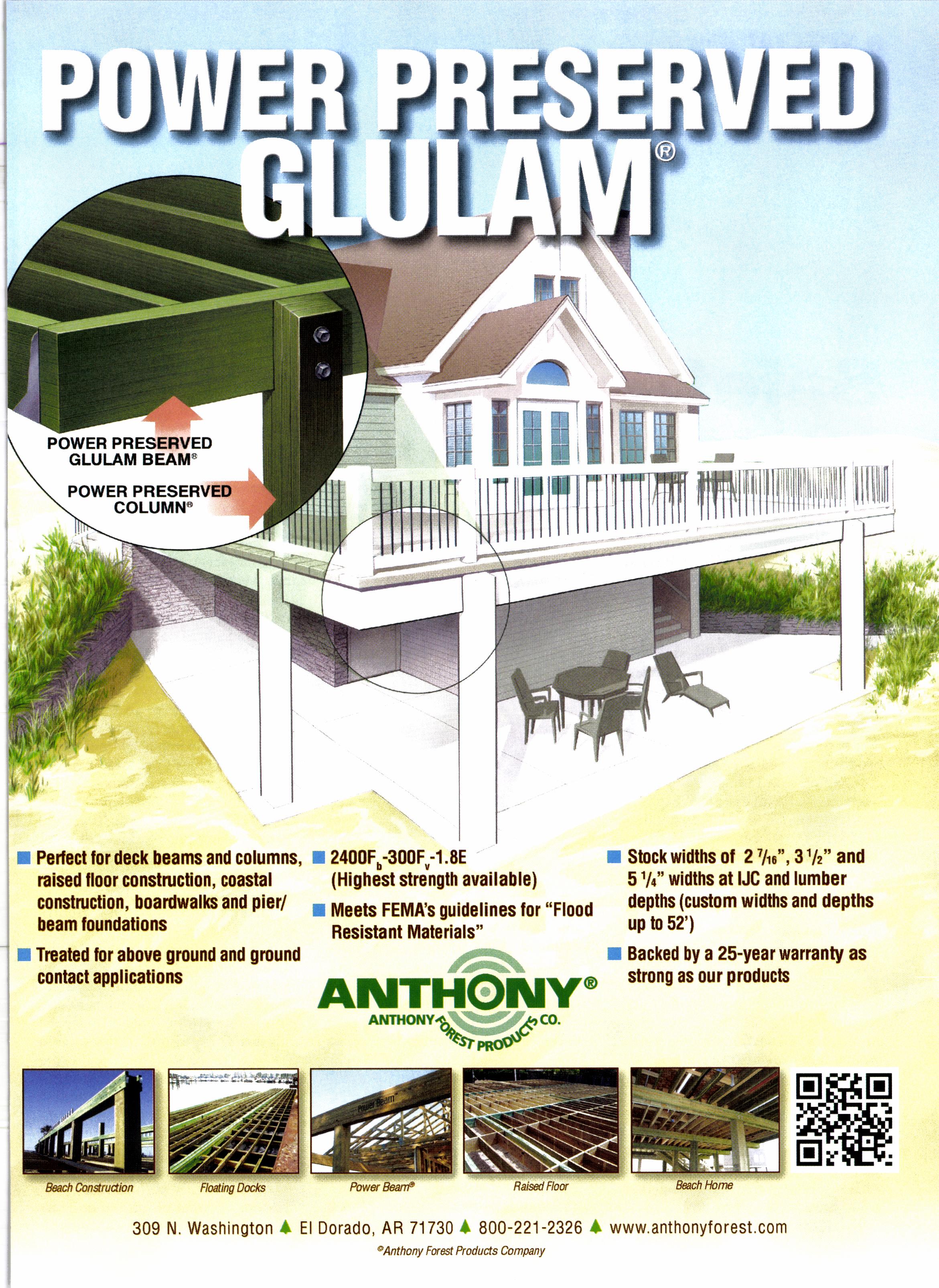 "On thc resiclential sidc of the n'rarkct, tleated glularns have bccn grou,in-u ntarkctshare whcn traclitional trcatcd southern pine lunrber and bearns do not n.rake the span." says Kcrlin Drake. vicc president ol'n'rarkcting at Anthony Forcst Proclucts, El Drtrado. Ar. "Thcy havc bccn a ntuinstay in thc non-rcsiclcntial ntarkct lirl bridgcs, park sl'rclters. and in cxterior cnvironmcnts whcrc {rclLtcd structural nrcmbcrs arc required."