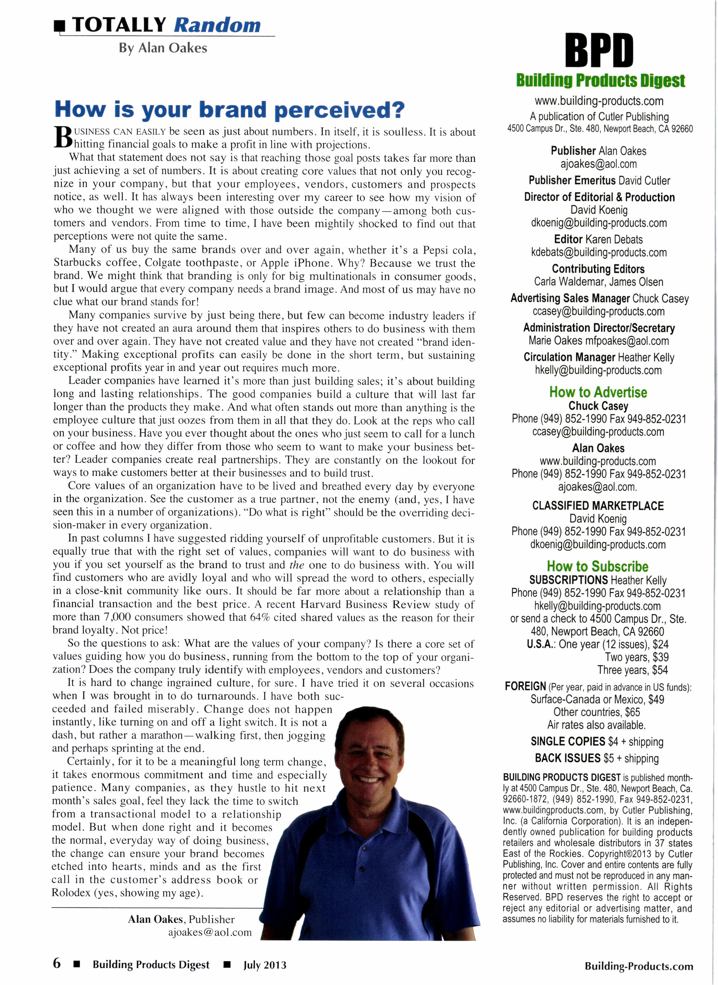 BUILDING PRODUCTS DIGEST is oublished monthly at 4500 Campus Dr., Ste. 480, Newport Beach, Ca. 92660-1872, (949) 852-1990, Fax 949-852-0231, www.buildingproducts.com, by Cutler Publishing, Inc. (a California Corporation). lt is an independently owned publication for building products retailers and wholesale dishibutors in 37 states East of the Rockies. Copyright@2013 by Cutler Publishing, Inc. Cover and entire contents are fully protected and must not be reproduced in any manner withoul written permission. All Rights Reserved. BPD reserves the right to accept or reject any editorial or advertising matter, and assumes no liability for malerials furnished to it.