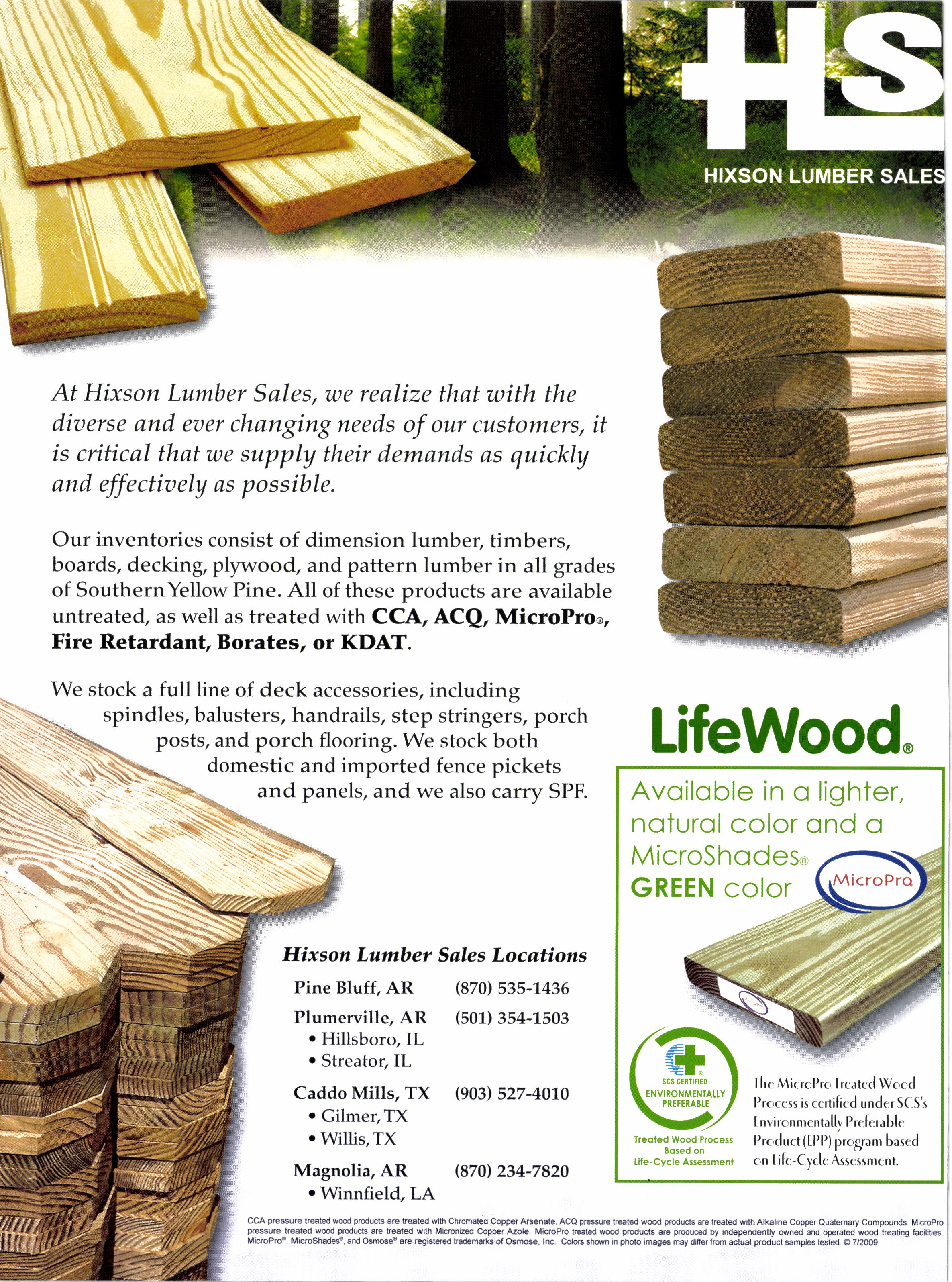 LifeWood. Hixson Lumber Sales Locations (903) 527-4010 (8701234-7820 CCA pcsure ir€l€d wmd pFducts ae keated with Chroretad Copper Afgmt€. ACQ presure t@i€d wad p.oducts are l@ted with Atkaline Copper Quatemary Compounds. Mic@Prc pre$uc t@tsd *ood prodrcls Er€ t(eat€d with MEroniz€d Copper Azol€. MkxoPro treted wood produqls @ prod@d by indepen&ntly ilned and ogs.atsd wood k@ting l*ititios. MlrcPrcG, MicrcShad$r, and O6@eo are regbt€Gd tr{remarks ot Ostr@. lrc CdG slwn In photo imag€ @y ditier trom a{tual prcduct smpts tst€d. c) 7/2009 Pine Bluff, AR Plumerville, AR Hillsboro,IL o Streator, IL Caddo Mills, TX . Gilmer,TX . Willis,TX Magnolia, AR . Winnfiel4 LA (870) 535-1"435 (s01) 354-1503 spindles, balusters, handrails, step stringers, porch posts, and porch flooring. We stock both domestic and imported fence pickets and panels, and we also carry SPF. -: SAvoiloble in o lighter, noturol color ond o MicroShodes, GREEN color [.(licroPro. r'il\ \ry/ n'o''tx::1:""'* Llfe-Cycle Assesimenl I hc MicroPrc, Trcatcd Wood Process is ccrtificd undcr SCS's I nvironnrcntallv Prcferablc Product (tPP) program basecl on I ifc-Cvclc Asscssnrcnt.
