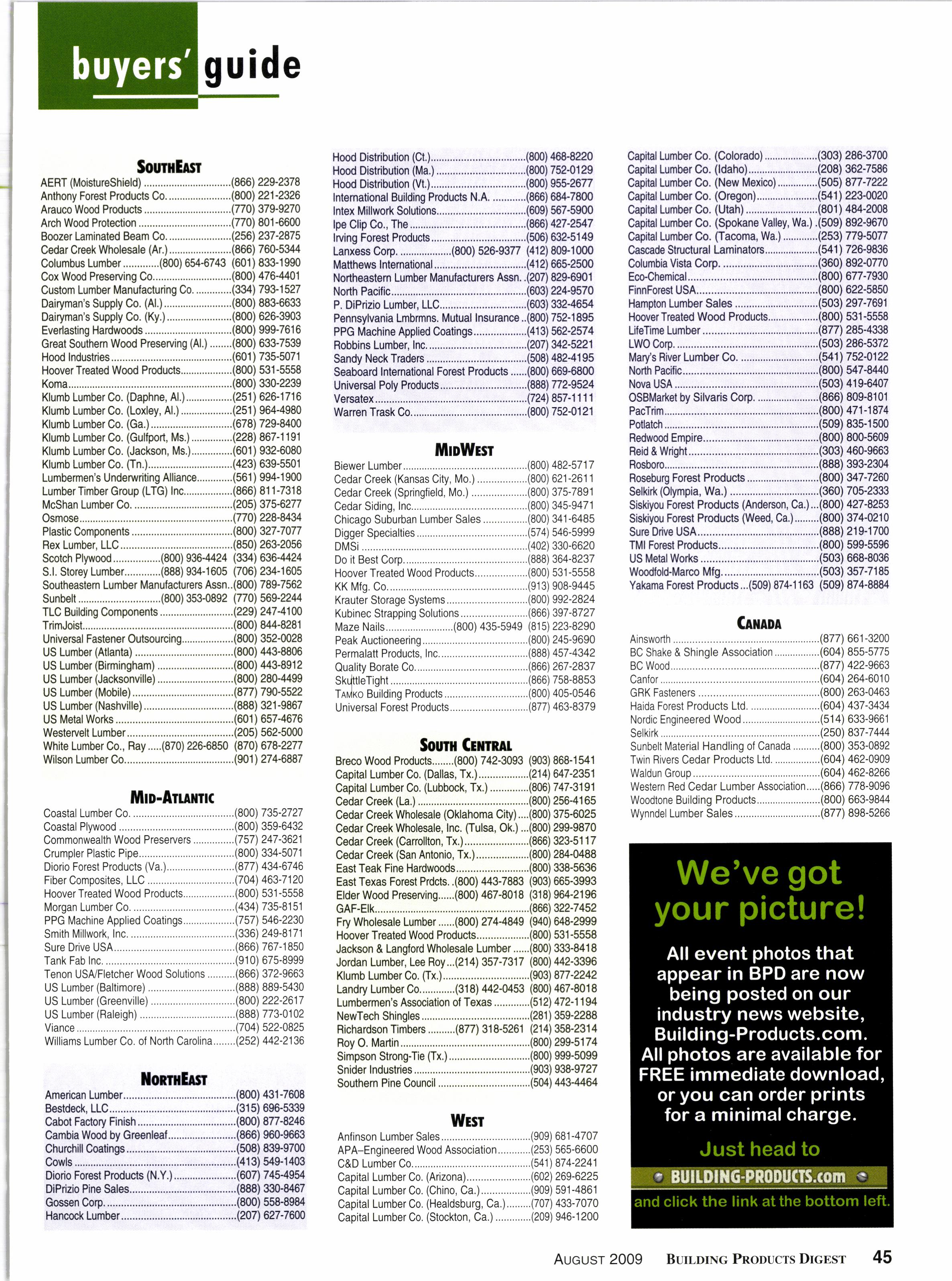 APA-Engineered Wood Association............(253) 565-6600 C&D LumberCo..... .......(541\874-2241 Capital Lumber Co. (Arizona).......................(602) 269-6225 Capital Lumber Co. (Chino, Ca.)..................(909) 591-4861 Capital Lumber Co, (Healdsburg, Ca.).........(707) 433-7070 Capital Lumber Co. (Stockton, Ca.) .............(209) 946-1200 Capital Lumber Co. (Colorado)..,.............,..,(Se) 28S3700 Capihl Lumb€r Co. (ldaho)...,....,...,....,...;...(20$ 062-7586 Capital Lumb€r Co. (New tt{exico)...........^lWl 877-7W. Cadbl Lumber Co. (Oregon)........:..,.,.,...,.".(541 l S23'0020 Capihl Lumbor Co. (Utah)......,.........,..,....;.,{80.|) 484-2008 Capibl bmber Co. (Spol€ns Vailey, Wa.) .{S00) 892-0670 Capital Lumber Co. fiacoma, Wa,) ....,...,".,.(A53) 779-507 Cascada Slructural 1aminato6,........,.....,,,,.($41) 72S9S36 columtia vista corp .-,!{3f0} 893.020 Eco0h€{nica1......... ......(80O) 6Z-79'30 FinnForEs{ USA....... .....(800) 622-5850 Hampton Lumber Sales .........................,.....(503) 297t691 How€r Treated Wood Pro&ds..,............,.,.(800) S3:t-5558 Lifelime Lumber.... ..,.,.{877) 285-41138 LWo Corp. ..,.,.(503) 286-5372 fuh|ys Riv€r Lumb€r Co. .......,.....................(il1! 7524122 No{h Pacjfic........... ......(800) tl7€440 NoaUSA.............. ......(5O3) 4194407 OsBl,laftet by Silyads Corp. .......................(866) 8GF8101 PacTrim.................. ......(8m) 471-1874 Poflatdr.................. ......(509) 835-1500 Redvood Empire..... .....(800) 80G5609 Reid & Wri9ht.......... .....(303) 46e9663 R0eb0r0.................. ....."(888) 393'230a Rosebur! Forest Products,,........,................(800) 347-7260 Selkirk (olympia, Wa.) ........,........................(360) 70$2333 Sisldyor Forest Products (Anrlerson, Ca.)...(800) 427-8253 Siskiyou Foroot Products (Ws€d, Ca.).........(800) 374-0210 Sure Drive USA.,.... ......(888) 219-1700 TMI Forest Prodrcts .....(800) 590-5596 us Meralwofis..... ....,,ts03) 668-8036 Woodfold-Marm Mfg ..,.(5ff )357-7185 Yal€ma Forost Produc'ts...(509) 874-1 163 (509) 874-8884 Cmlol Ainsworth,.............. .,....(877) 661-3200 BC Shake & Shingle Association..,..,.,.....,...(604) 855-5775 BCW00d................. .....(877\ 422-9663 Cani0r....,.,............. ......(604) 264-6010 GRK Fasteners...... ....,.(800) 263-0463 Haida Forest Products 1td. ....,.......,.............(604) 437-3434 Nordic Engineered Wood.....................,..,....(51 4) 633-9661 Selkirk ,..,.,.............. ......(2501 837-7444 Sunbelt Material Handling of Canada,.....,...(800) 353-0892 Twin Rivers Cedar Products Ltd. ..............,,.(604) 462-0909 Waldun Gr0up........ ......(604) 462-8266 Western Red Cedar Lumber Association.....(866) 778-9096 Woodtone Building Products........,...............(800) 663-9844 Wynndel Lumber Sa|es...........................,....(877) 898-5266