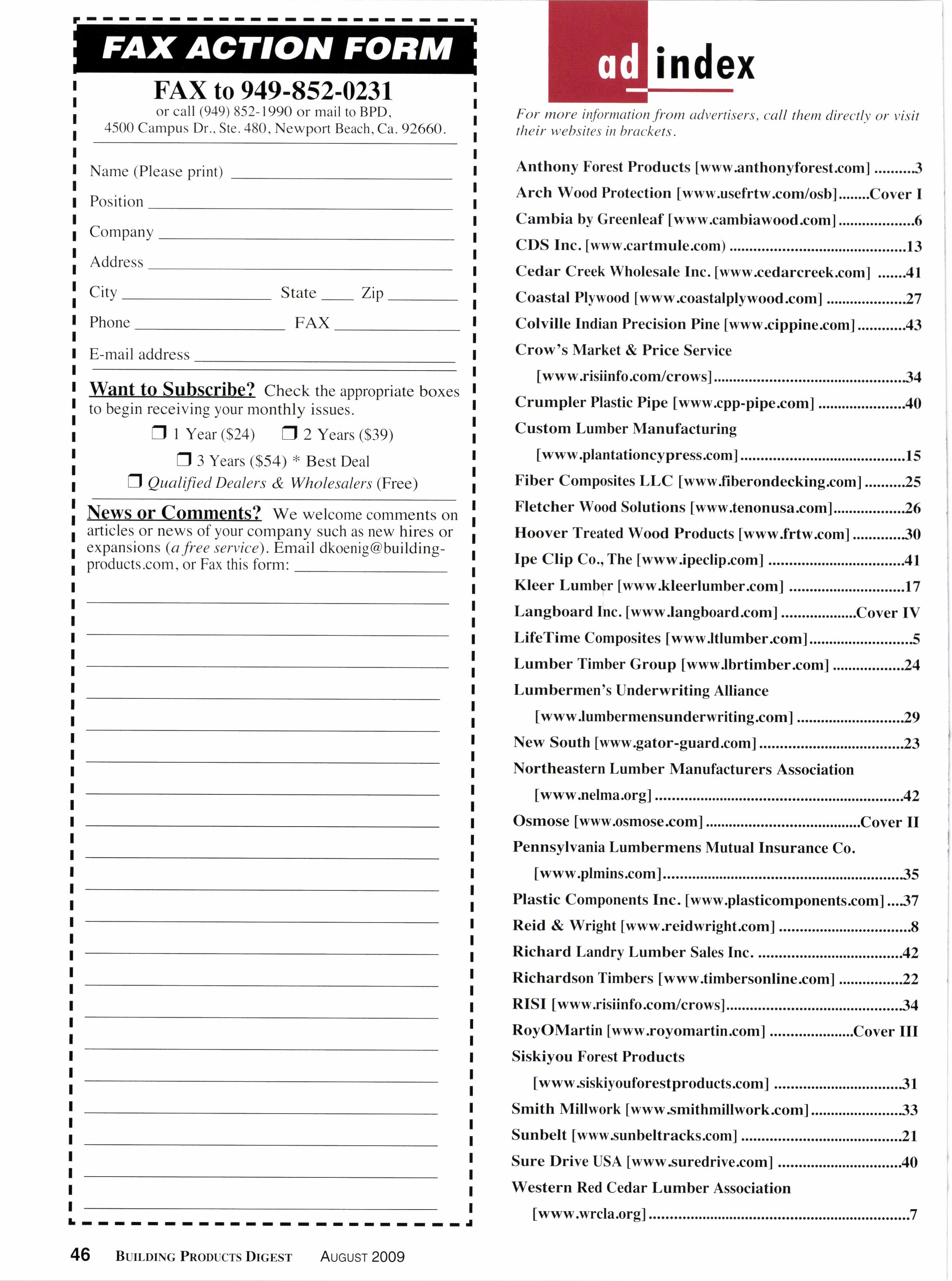 Ihc. Iwww.langboard.com] ...................Cover IV LifeTime Composites [www.ltlumber.com] .........................5 Lumber Timber Group [wwwJbrtimber.com] ..................24 Lumbermen's Underwriting Alliance Iwww.lumbermensunderwriting.com] ..........................29 New South [www.gator-guard.com]