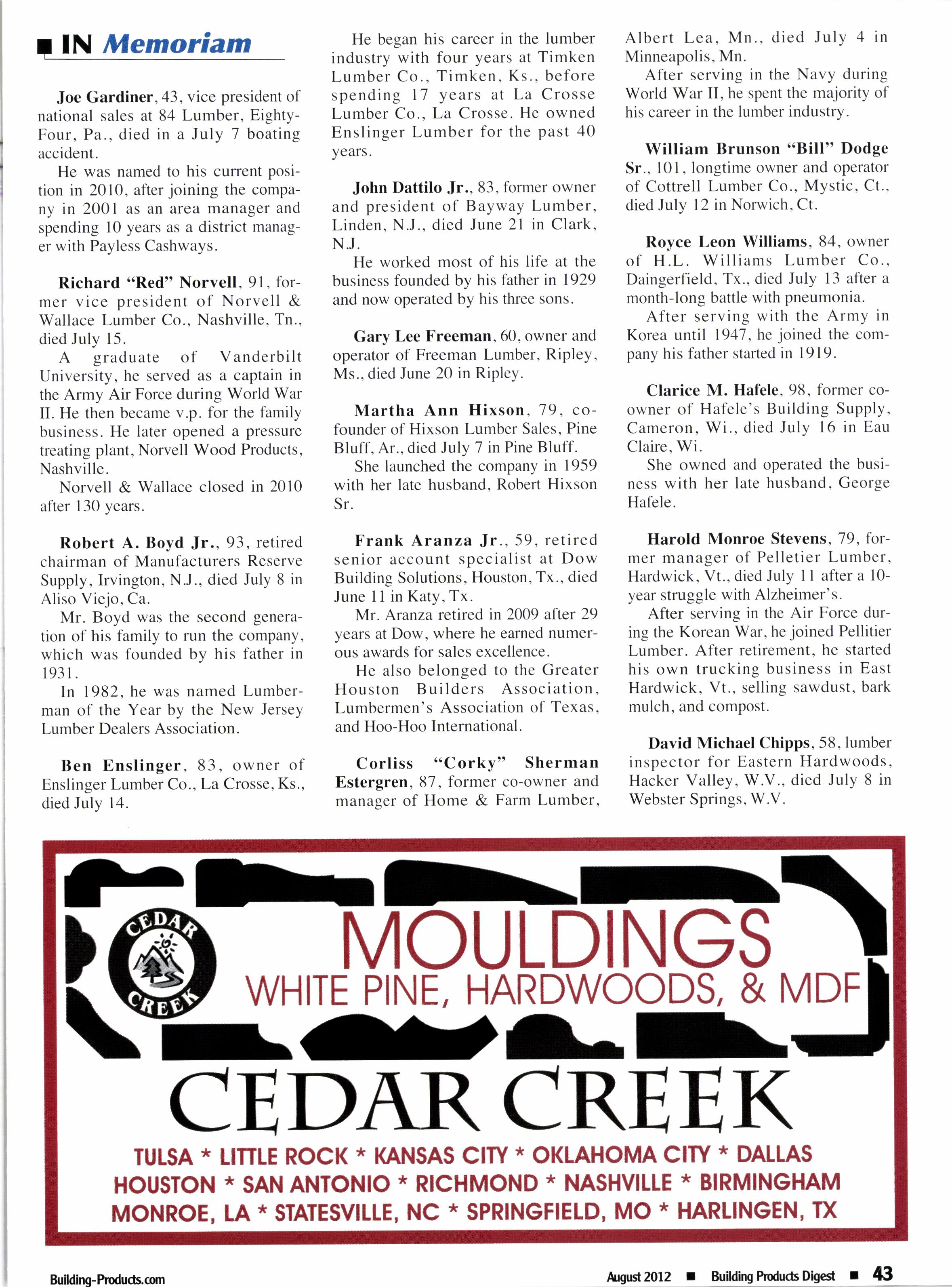 Richard "R€d" Norvell, 91, former vice president of Norvell & Wallace Lumber Co., Nashville, Tn., died July 15.