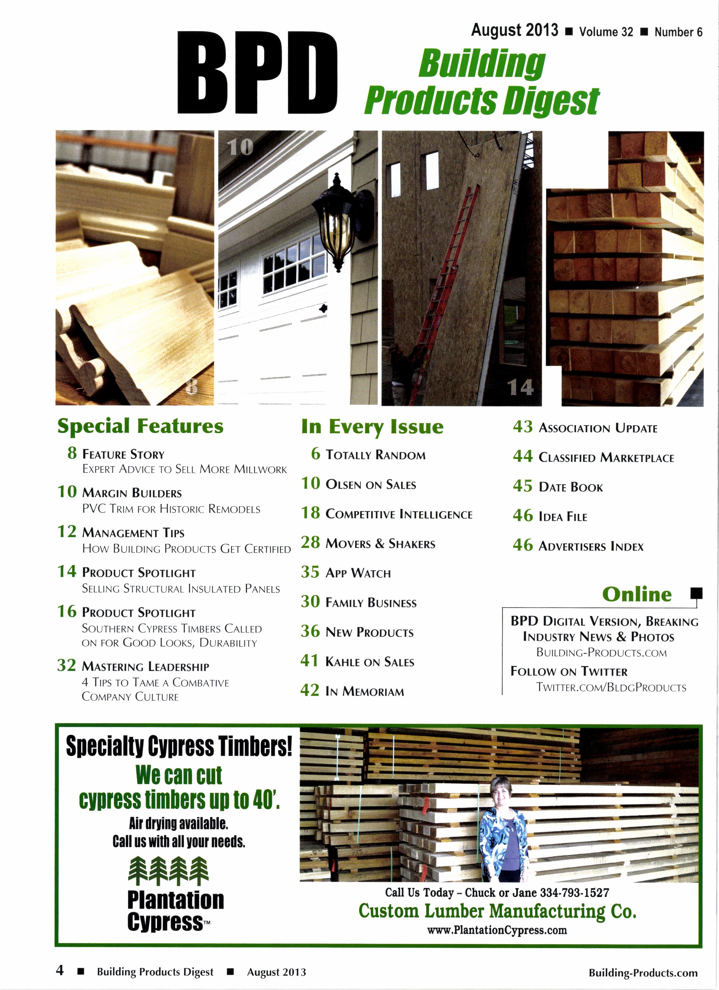 BPD Special Features ln Every lssue 6 Tornlly RlNoor'r 10 osrN on Snles 1 B Coruprrrnvr lnrrurcENCE 28 Movrns & Snrxrns 35 npp WlrcH 30 Fn,r,uLv Busrrurss 36 rurw Pnooucrs 41 KnHr-r oN Srlrs 42 lN Mrmonrnm 43 AssocrmoN Uponrr 44 CLnssrrrEo Mnnxrrpmcr 45 Dlrr Boox 46 lorn Frrr 46 Aovrnrrsrns lrorx Online BPD Drcrrnr VrnsroN, Bnrnxrrc lNousrny Nrws & PHoros B urrorNc- PnoDUCTS.coM Follow oN Twrrrrn Twrrrrn.cola/B roc Pnooucrs August 2013 r Votume32 r Number6 BuililinA Proilucts Digest B Frnrunr Srony Exprnr Aovrcr ro Srlr Monr MrnwoBr 10 MnncrN Bunorns PVC Tnru roR Hrsronrc Rrvoorls 12 Mnlrncrrvrrur Trps How BurlorNc PRooucrs Crr Crnrrrreo 14 Pnooucr Sporucnr SrluNc SrRucrunnr lNsurRrro PaNrt.s 16 Pnooucr Spor-rcnr SoutHsRN CypRess Trvsrns Cnrrro oN FoR Cooo Loors, DuRRerrrtv 32 Mnsrrnrrc Lreornsnrp 4 Trps ro TRur R Covenrrvr CoupRNY Currunr $rccialty Cyuess lim[erc! te can cut cnlcss timlG6 [I t0 f0'. lil dilin! eulilrilG. |!all us uitl allruw needs. Call Us Today - Chuck or Jane 334-793-1527 4 I Building Products Digest I August 2013 Building-Products.com